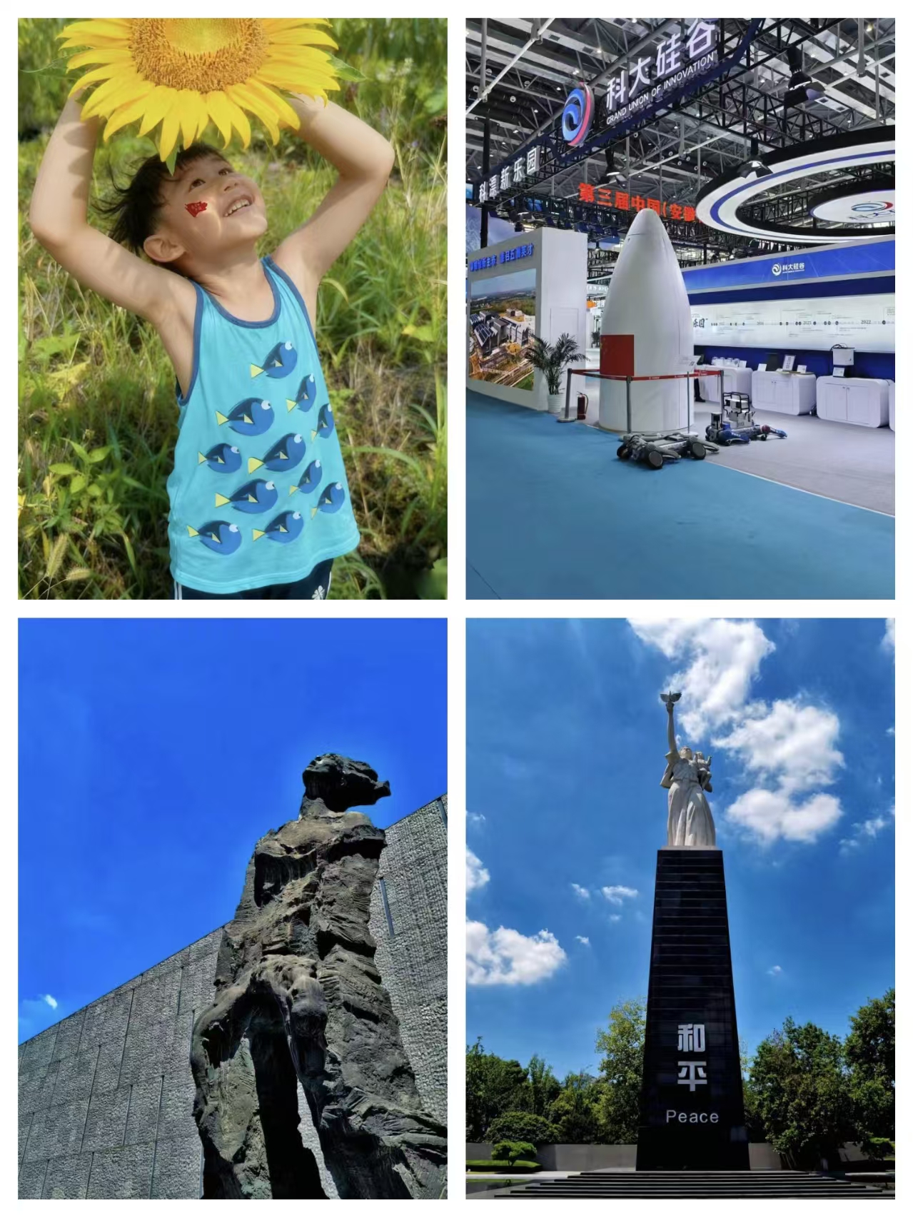 作品更以细腻的视角,触摸祖国的温度与愿景,将感恩之情具象化为生活点滴:民生幸福:孩童举着向日葵的笑脸、科创展台的智能设备,展现祖国守护下的岁月静好与成长平台;历史铭记:沧桑雕塑凝固历史记忆,提醒今日荣光的来之不易,感恩先辈的砥砺前行;和平期许:“和平”主题雕塑在晴空下舒展,承载对家国安宁的珍视与对未来的美好憧憬。生活之甜到科技之进,从历史之思到和平之愿,镜头里的每一帧画面,都是青年对祖国最滚烫的感恩告白。