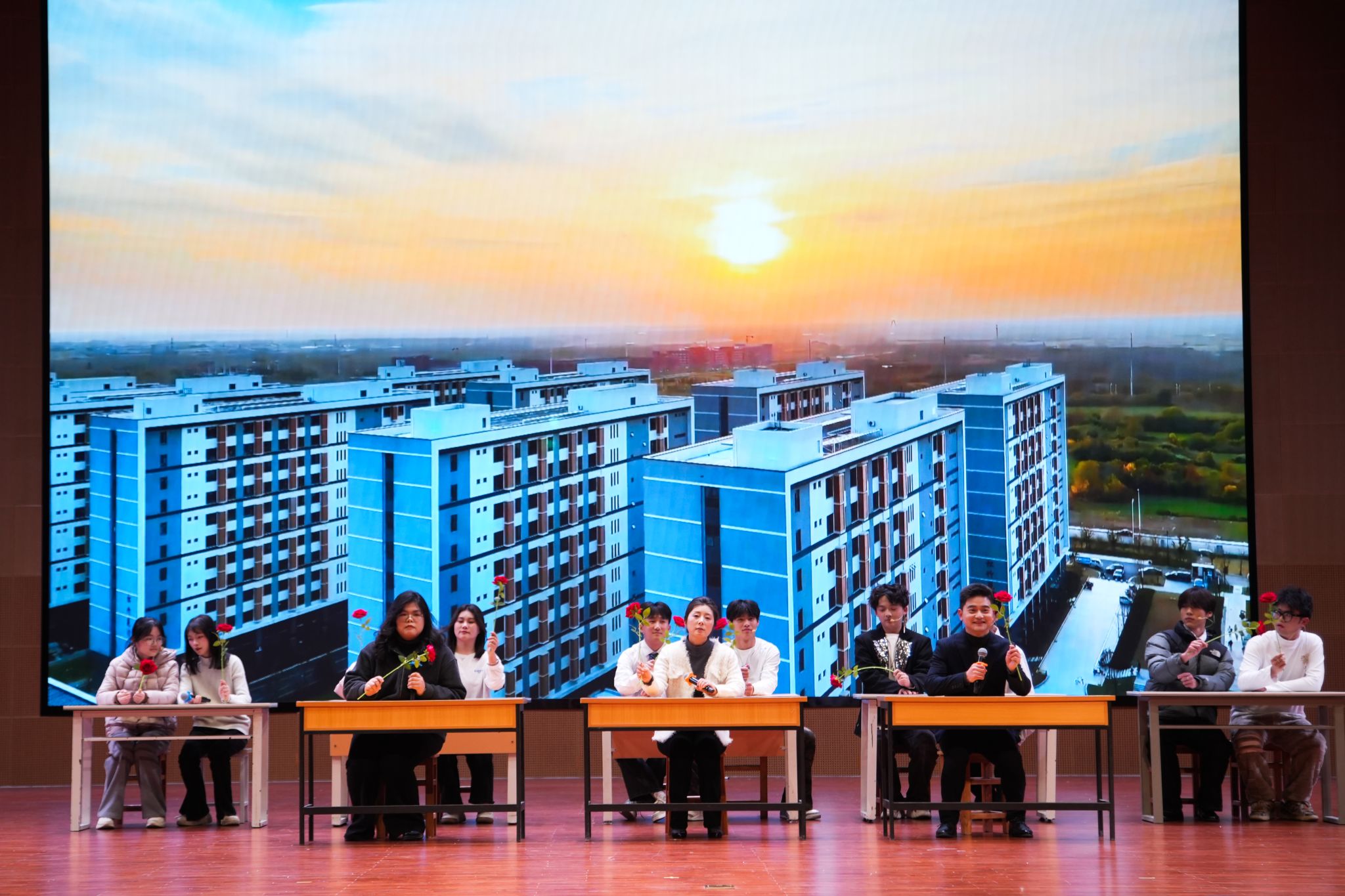 晚会在极具科技感的视觉交响中拉开序幕,激光勾勒科技星河,机械舞步激荡未来脉搏。智慧代码与光束同频,打造出人工智能与人类共创的视觉交响,瞬间点燃全场氛围。学生的礼服走秀《繁星霓裳》、双人舞、齐舞《爱乐之城》,充满力量与美感;合唱、歌曲串烧等将青春的热烈展现得淋漓尽致;10位教师的古典舞《长安三万里》以灵动身姿演绎盛唐水墨长卷;师生同台是本次晚会一大特色,由师生共同演绎的朗诵《月光下的中国》、歌曲《送你一朵小红花》等传递着师生间的陪伴与守护、浓浓情谊在会场流淌。教师独唱《再回首》以深情旋律带领观众走进回忆走廊,晚会在歌曲《相亲相爱》的旋律中画上圆满句号。