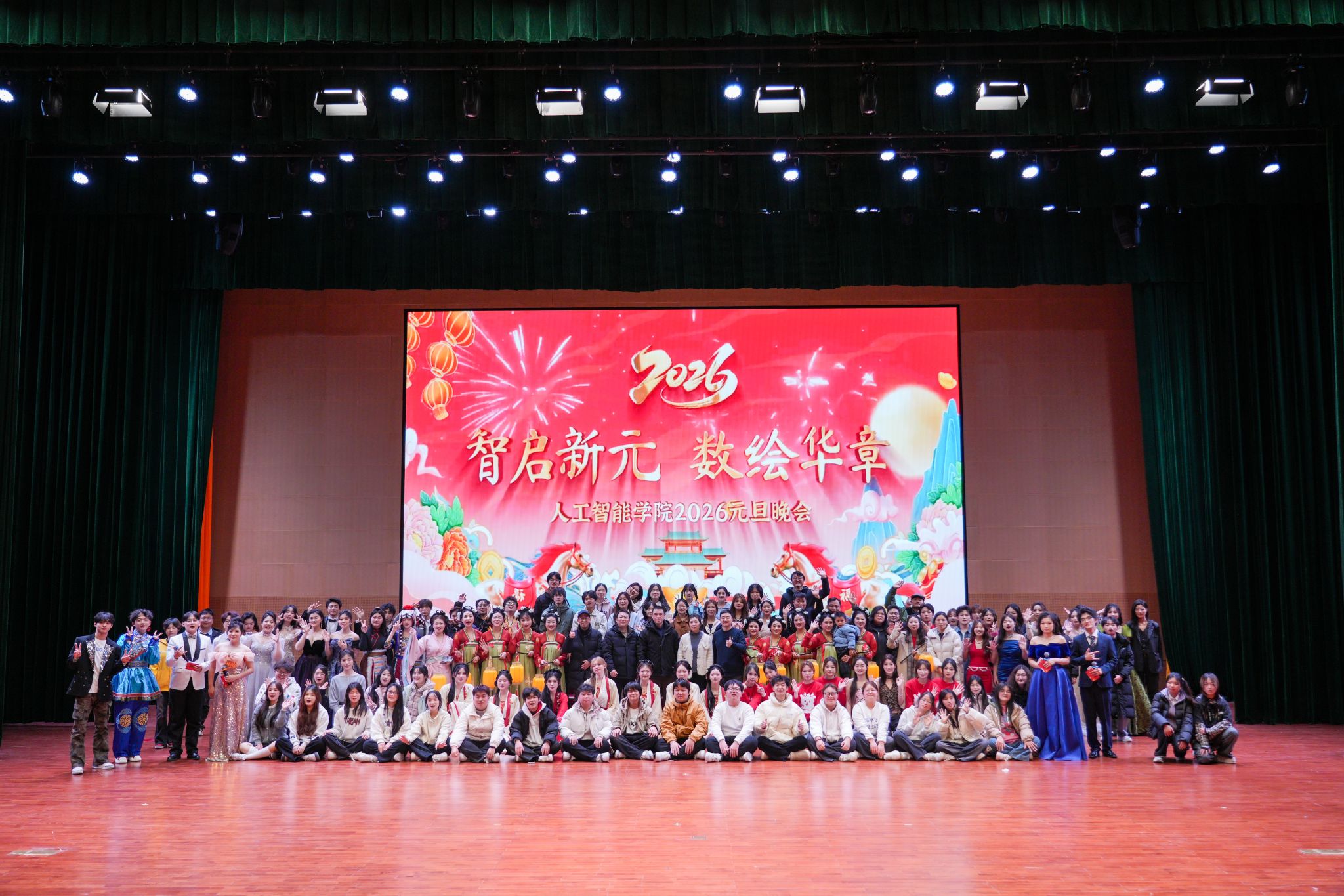 灵蛇盘结丰收岁,骏马迎新踏春来。1月7日晚,人工智能学院2026年“智启新元,数绘华章”新年晚会精彩上演。学院党总支书记胡冰、副院长(主持工作)张峰,校团委书记张静,学院副院长丁玉奇、党总支副书记孙巍巍,及校团委和学院其他领导与师生欢聚一堂,共同观看演出。