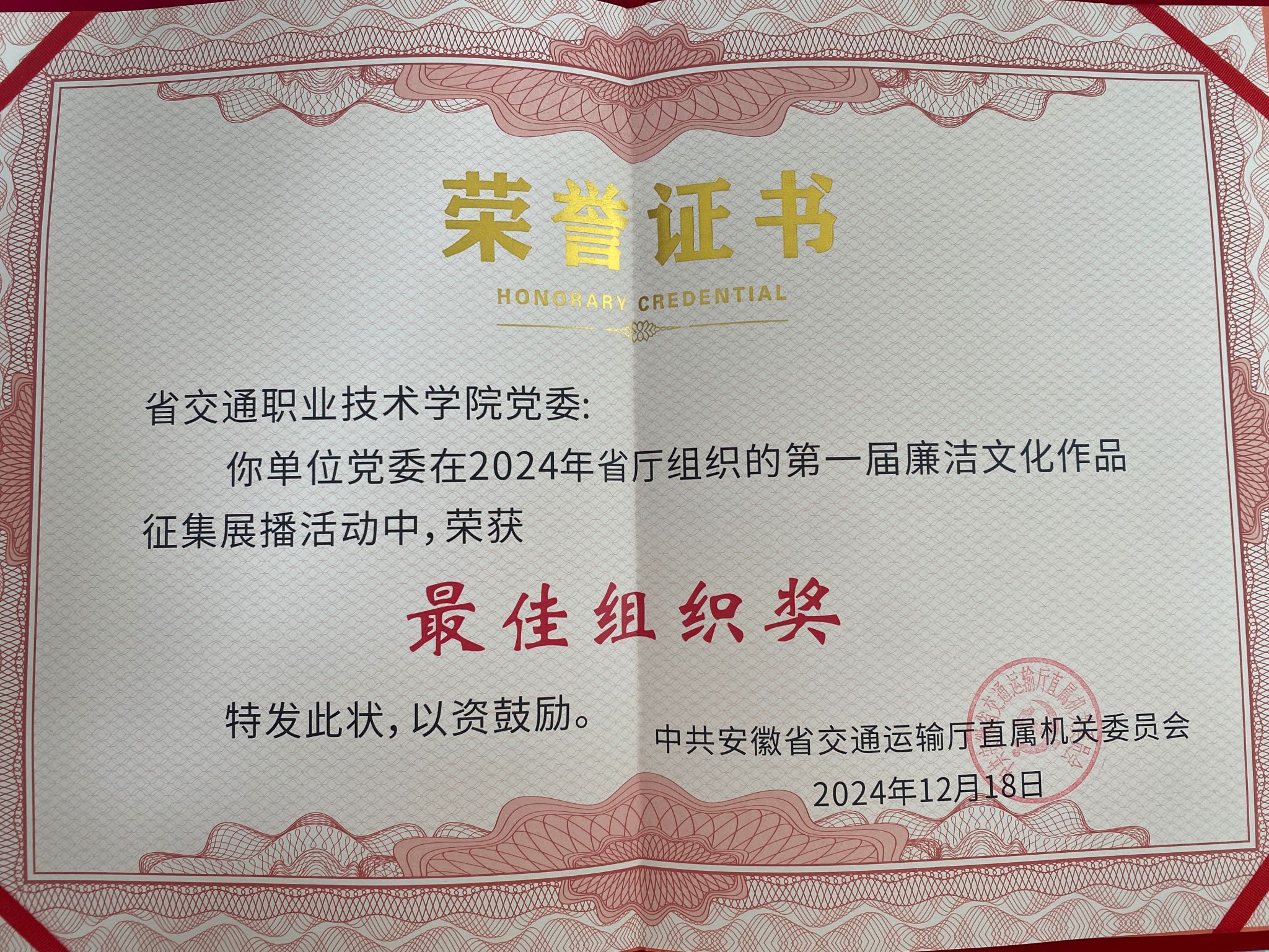 为深入学习贯彻习近平文化思想和习近平总书记关于党的自我革命的重要思想,在省交通运输厅举办的第一届廉洁文化作品征集展示活动中,学院党委高度重视,积极组织师生踊跃参与,共报送原创作品55件,最终29件作品入选,学院党委获得“最佳组织奖”,5件作品获得“最佳作品奖”,9件作品获得“优秀作品奖”,15件作品获得“入围奖”。