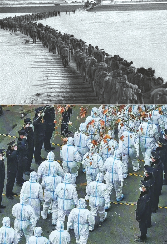 上图:新中国成立不久,帝国主义将战火烧到鸭绿江边,为了保卫祖国和人民家园,中国人民志愿军跨过鸭绿江抗击侵略者。新华社发(黎民 摄) 下图:新冠肺炎疫情来袭,各地医疗工作者白衣为甲、逆行出征,守卫人民生命健康。 (图片来源:共青团中央微博)