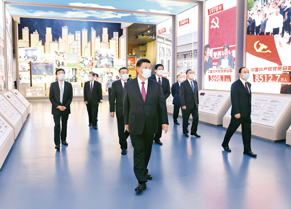 2021年6月18日,党和国家领导人习近平、李克强、栗战书、汪洋、王沪宁、赵乐际、韩正、王岐山等在中国共产党历史展览馆参观“‘不忘初心、牢记使命’中国共产党历史展览”。 新华社记者 鞠鹏/摄