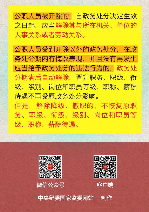 公职人员受到开除以外的政务处分,在政务处分期内有悔改表现,并且没有再发生应当给予政务处分的违法行为的,政务处分期满后自动解除,晋升职务、职级、衔级、级别、岗位和职员等级、职称、薪酬待遇不再受原政务处分影响。但是,解除降级、撤职的,不恢复原职务、职级、衔级、级别、岗位和职员等级、职称、薪酬待遇。