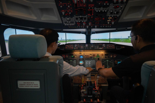 随后,来宾参观航空器燃料重点实验室、民航运输地面服务实训室、无人机实训室、飞行模拟器实训室、飞机机库五大实训场景。民航运输地面服务实训室内,学生正在进行值机、安检、行李分拣全流程模拟,该实训室配备1:1还原的机场值机柜台、双通道X光机等设备。飞机机库内,停放着两架退役通用飞机——R44直升机“雷鸟1”与SA60L轻型运动飞机,为航空器维修、航空器基本结构学习及体验课程提供了绝佳的教学资源。