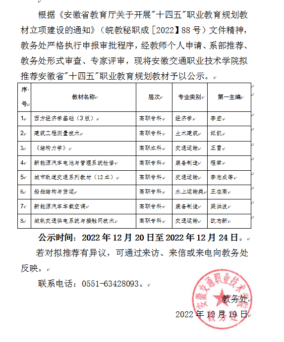 关于拟推荐安徽省"十四五"职业教育规划教材的公示