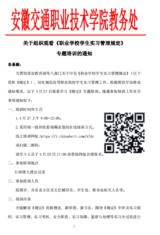 关于组织观看《职业学校学生实习管理规定》 专题培训的通知