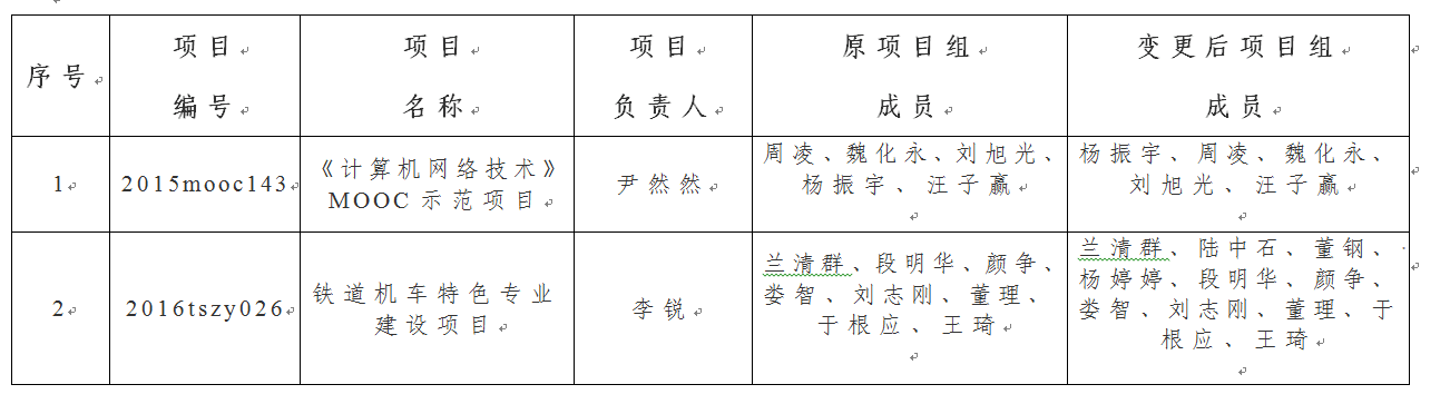 经项目负责人书面申请,所在部门同意,教务处科研管理部门备案,拟变更省级质量工程部分项目组成员,现予以公示。