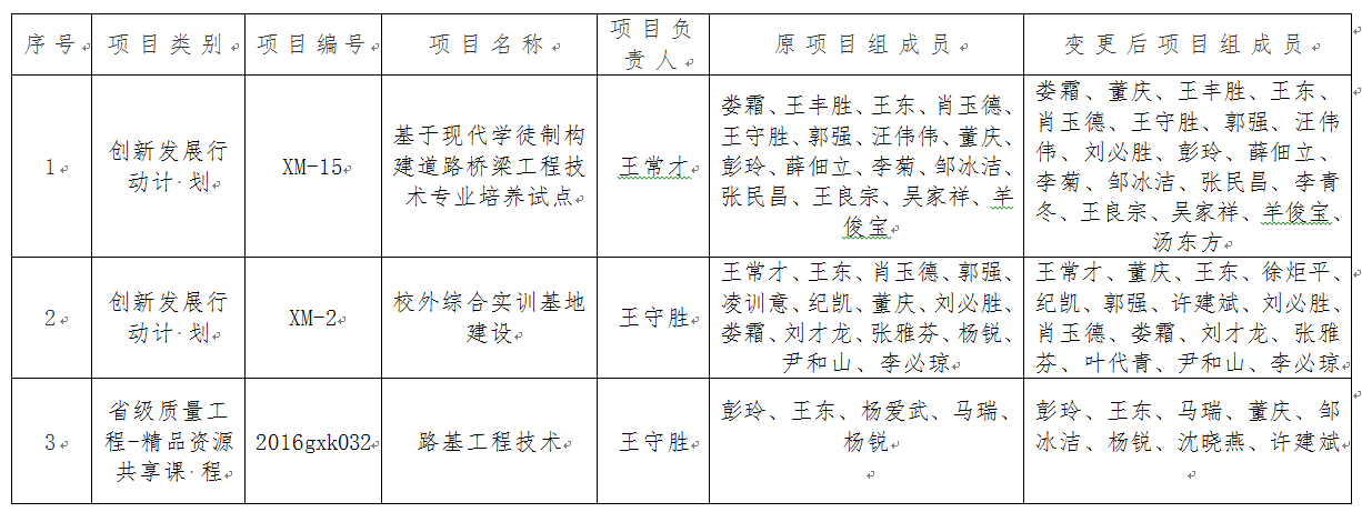 经项目负责人书面申请,所在部门同意,教务处科研管理部门备案,拟变更创新发展行动计划和省级质量工程项目部分项目组成员,现予以公示。