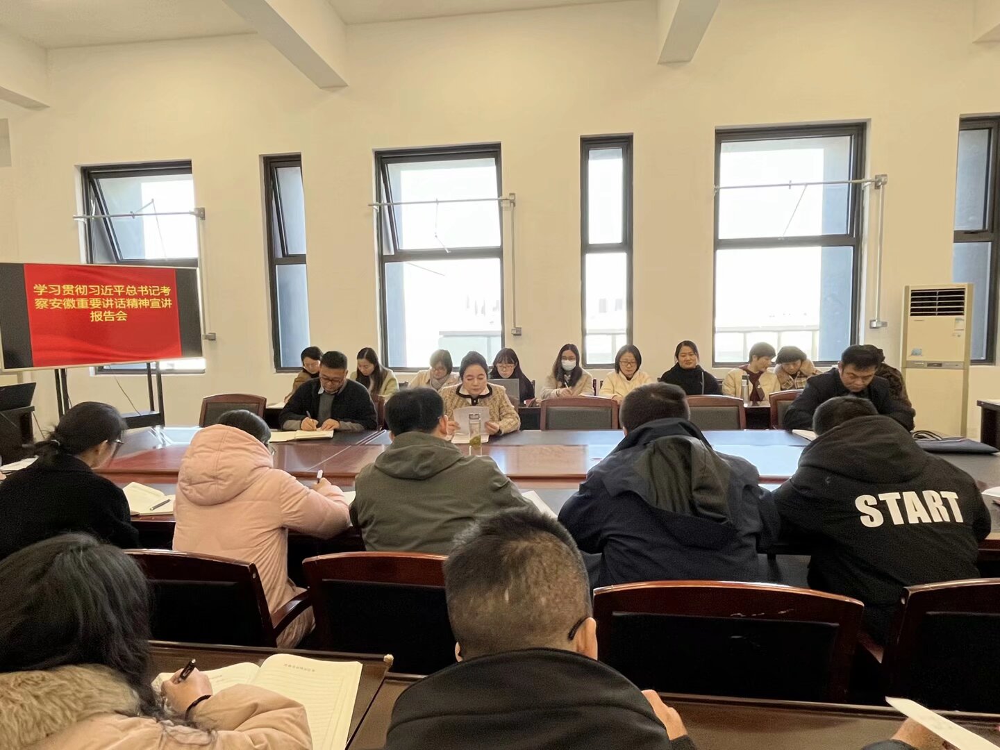 梁洪波以《从总书记“安徽行”中汲取奋斗力量,奋力谱写安徽交院“两高一本”新篇章》为题,围绕充分认识习近平总书记考察安徽重要讲话的重大意义、深刻领会习近平总书记考察安徽重要讲话精神的丰富内涵、切实推动习近平总书记考察安徽重要讲话精神落地生根等方面,结合学院工作实际,进行了系统阐述和深入解读。