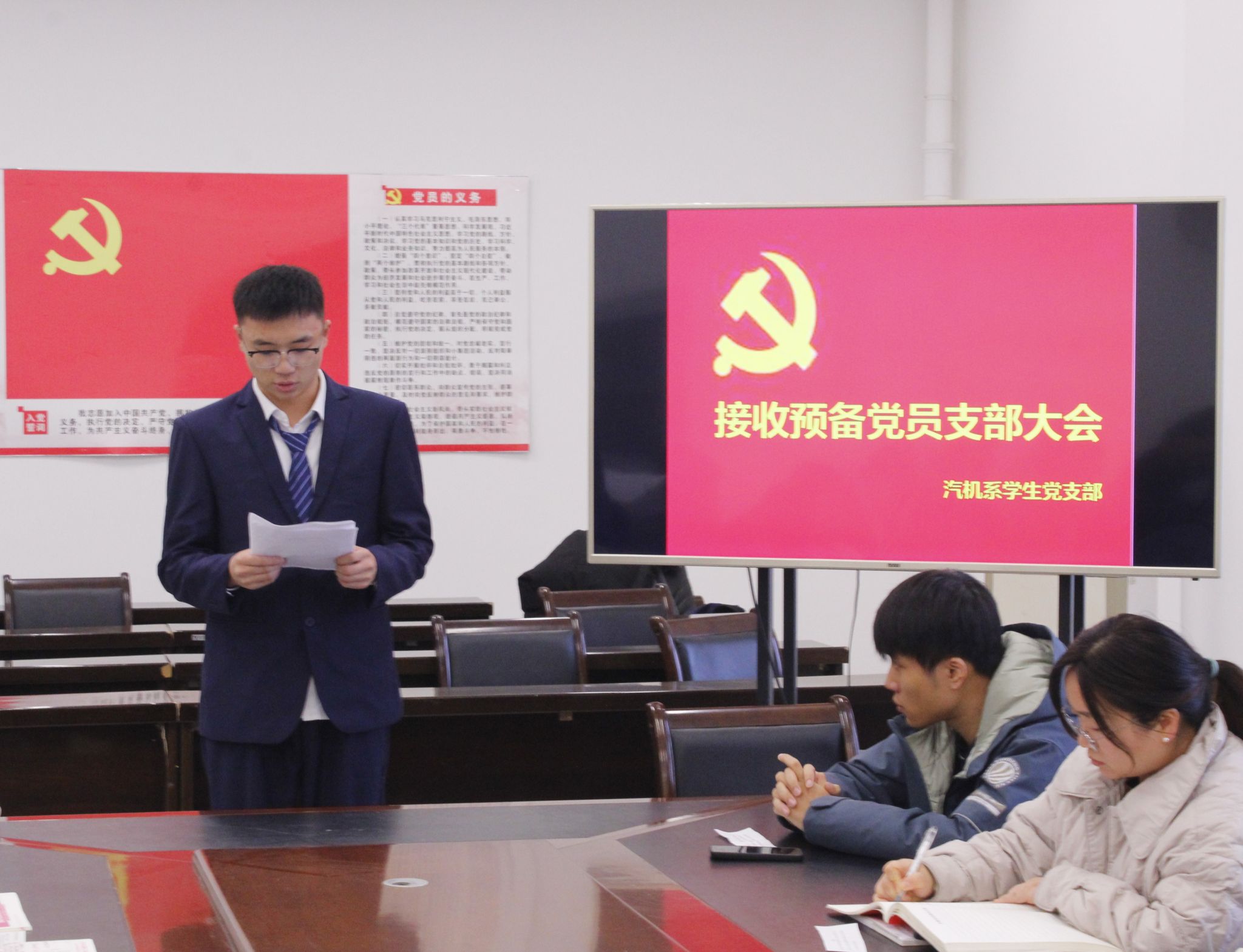 为做好党员发展工作,加强党的基层组织建设,凝聚新力量,11月25日上午,汽车与机械工程系学生党支部在致远楼A409会议室召开预备党员接收大会。汽车与机械工程系学生党支部全体党员、发展对象参加会议,会议由党支部书记钟飞飞主持。