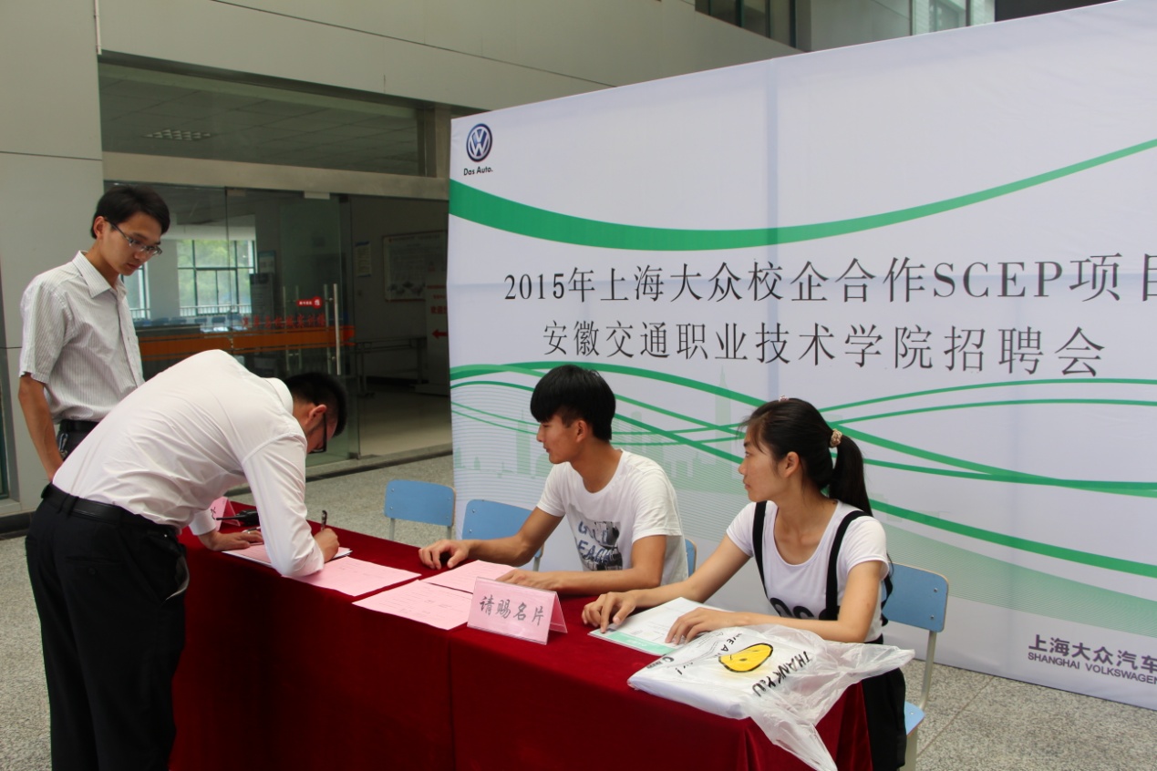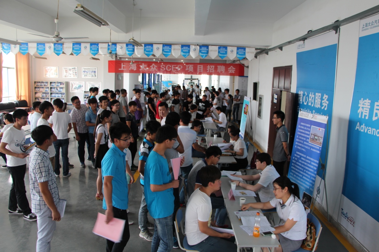 6月10日下午,米兰milan官方网站上海大众SCEP校企合作项目专场招聘会在汽车与机械工程系实训中心举行,上海大众安徽商务处经理郁小弟先生、上海大众华中RSSC策略经理杨智夏先生,汽车与机械工程系主任杨柳青教授出席了会议。华中地区16家经销商参会,并进行现场招聘。此次招聘会共提供146个岗位,汽车与机械工程系81位大二学生参加了此次招聘会,招聘会现场秩序井然,个别单位招聘呈现“一生难求”的现象。