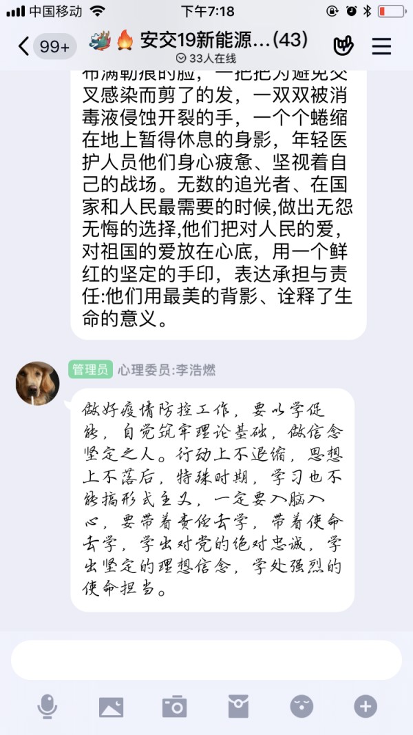 本次课程解读以习近平同志为核心的党中央关于疫情防控的决策部署,分析了我国抗疫彰显的中国共产党领导和中国特色社会主义制度的显著优势,讲述了防疫战疫一线的感人故事。同学们学习完本次课程后,自发在班级群内积极讨论,同学们纷纷表示接受了一次深刻的思想教育和精神洗礼,一系列鲜活的事例让学生们内心波涛汹涌,真切感受到祖国强大的凝聚力,作为青年人,应继往开来,不负使命。