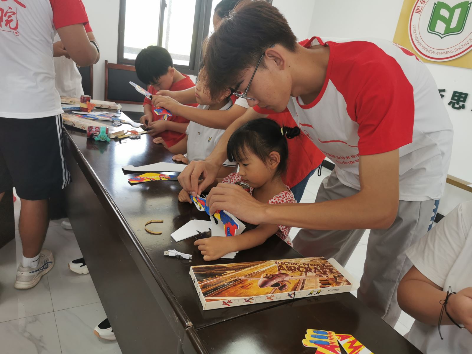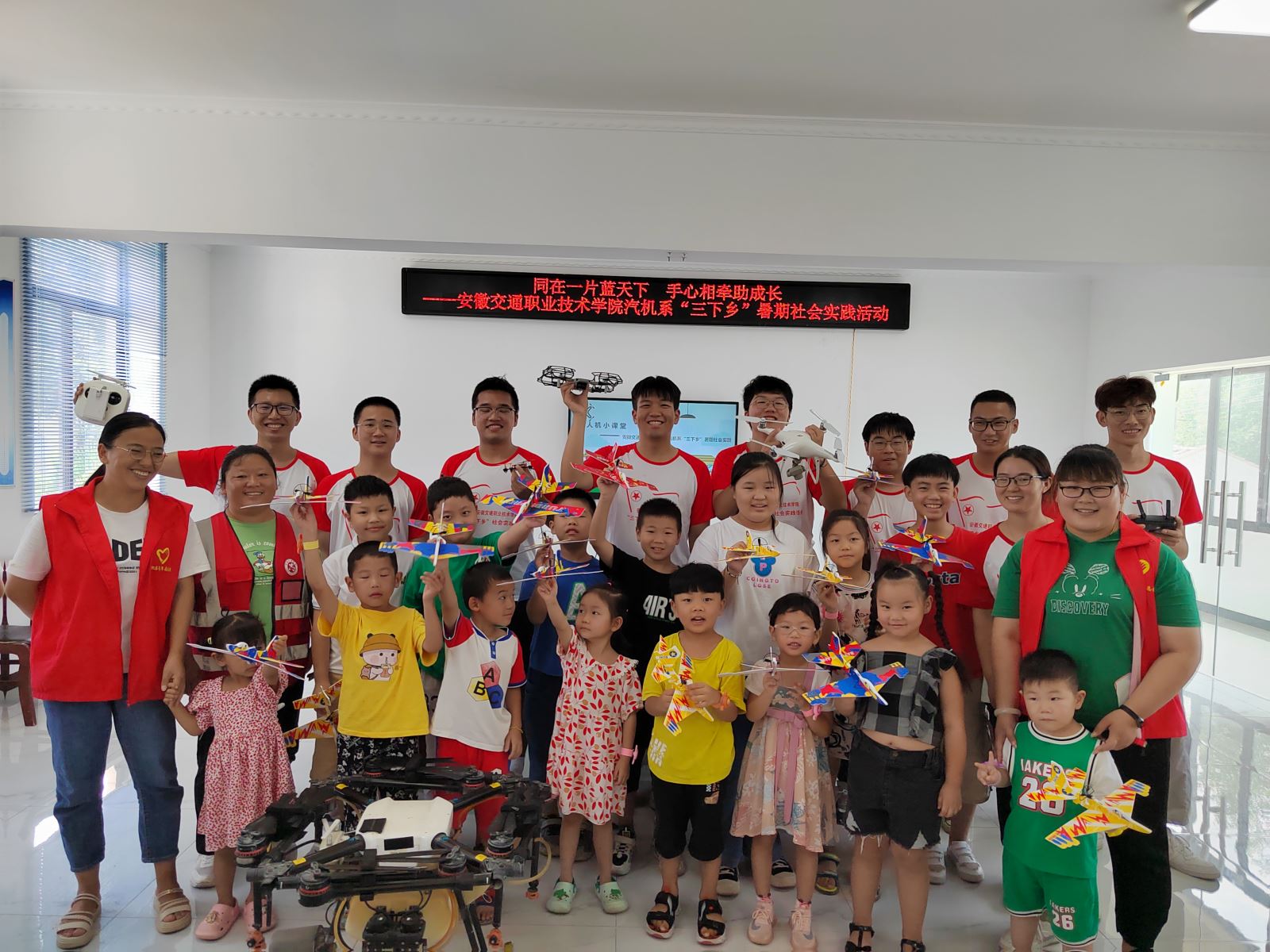 为守护留守儿童安全,拓宽留守儿童视野,8月3日上午,实践团在村委办公室开展了“同在一片蓝天下 手心相牵助成长”活动。安全知识教育环节中,同学们结合PPT、知识问答、动画视频、改编儿歌等方式为小朋友们讲解了交通安全、消防安全、防溺水、防拐骗等知识。无人机小课堂里,同学们为小朋友们科普了什么是无人机、无人机的分类及应用领域等知识,并让大家近距离观察无人机,认识无人机的主要结构及用途,精彩的无人机表演更是让小朋友看得入迷,激发了他们学习航空航天知识,探索科学世界的热情。最后,实践团给大家分发了电动纸飞机,手把手教小朋友拼装,拉近了彼此的距离,让小朋友们在快乐中学习成长。