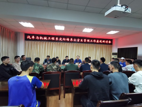 为进一步完善定向培养士官生的人才培养机制,10月23日晚七点,汽车与机械工程系在南区教学楼三楼会议室组织召开定向培养士官生管理工作座谈研讨会。系党总支书记李家林、学生处副处长徐刚、士官班辅导员、系复员退伍学生及士官班学生干部参加了本次座谈研讨会。