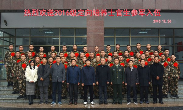 12月26日下午,学院举行2016级定向培养士官生入伍欢送会。包河区人武部部长朱宏刚受邀参加。院长张国栋、院学生处领导、我系主任杨柳青、系党总支书记李家林及辅导员解鹏等一起欢送士官生入伍。