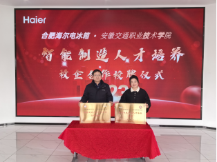 戴明阳对学院开展访企拓岗促就业活动表示热烈欢迎,并陪同梁洪波一行参观了合肥海尔电冰箱有限公司的智慧生产车间。李佳慧从企业现状、基地建设背景、建设模式、资源投入等方面对公司进行了详细介绍。梁洪波介绍了米兰的办学历史、专业建设情况、校企合作历程,表示海尔在产教融合方面做的很有特色,希望双方能够发挥各自的优势,在师资培养、课程设置、基地建设方面持续创新,取得一批可复制、可推广的成果,为学生提供良好的就业环境,提升学生的幸福感。会后,梁洪波和戴明阳共同为“智能制造产业人才培养合作基地”揭牌。
