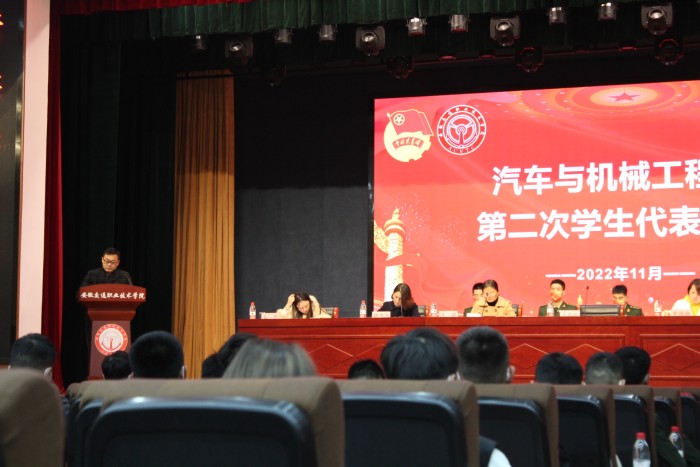 银杏满地黄,红枫似火照。在这秋收冬藏的美好季节里,为深入学习贯彻党的二十大精神,全面落实学联学生会改革的要求,进一步加强我系学生会组织建设,团结凝聚汽机广大青年学子,11月18日下午,汽车与机械工程系第二次学生代表大会在南区大礼堂举行。汽车与机械工程系党总支书记沈劲松、系党总支副书记汪莉、学生管理老师、二十二届学生会主要负责人、正式代表、列席代表共计七十余人参加了会议。开幕式由系团总支书记钟飞飞主持。