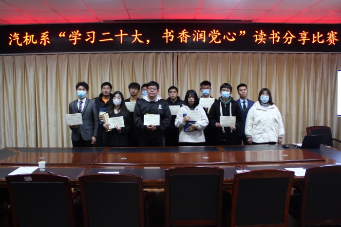 党的二十大报告明确指出,深化全民阅读活动。为激发广大同学爱读书、读好书、荐好书的良好风尚,营造浓厚的书香校园氛围,12月4日晚,汽车与机械工程系“学习二十大,书香润党心”读书分享比赛在南区教学楼三楼会议室开展。来自21级、22级的二十余名同学参加了此次活动。