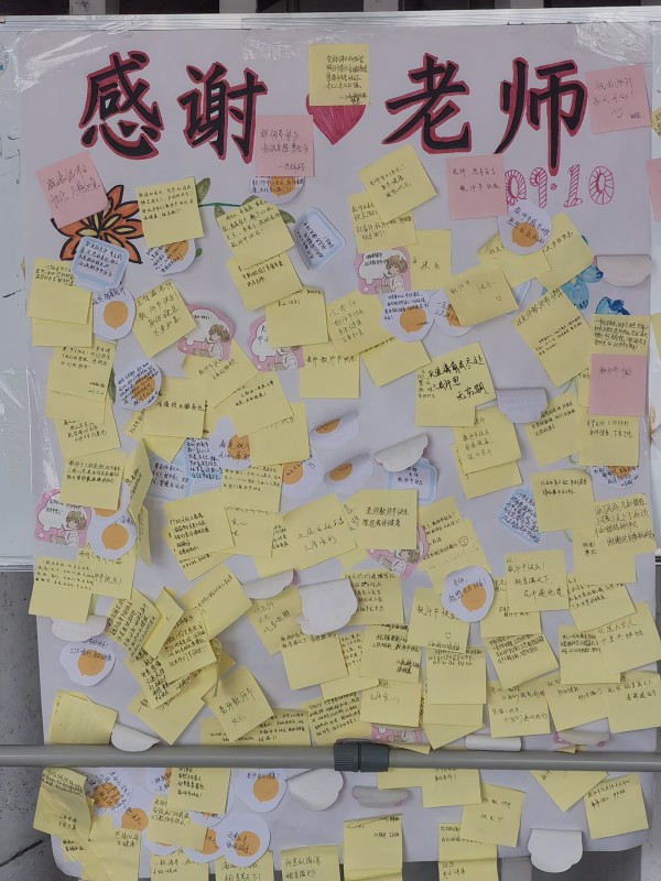 9月9日晚,各班同学利用晚自习时间书写了“感谢恩师”祝福便签。9月10日早上,同学们进入教学楼时,将自己精心书写的祝福便签粘贴在深情告白板上,用满怀深情和感恩的话语表达了对老师们的感谢和祝福。而在当天的每一节课上,每个班级全体同学都集体起立,一齐向敬爱的老师鞠躬或敬礼,并大声一致得说“老师,节日快乐”。课堂上,同学们专心听课,认真互动,用最质朴的行动感恩老师的辛苦耕耘。