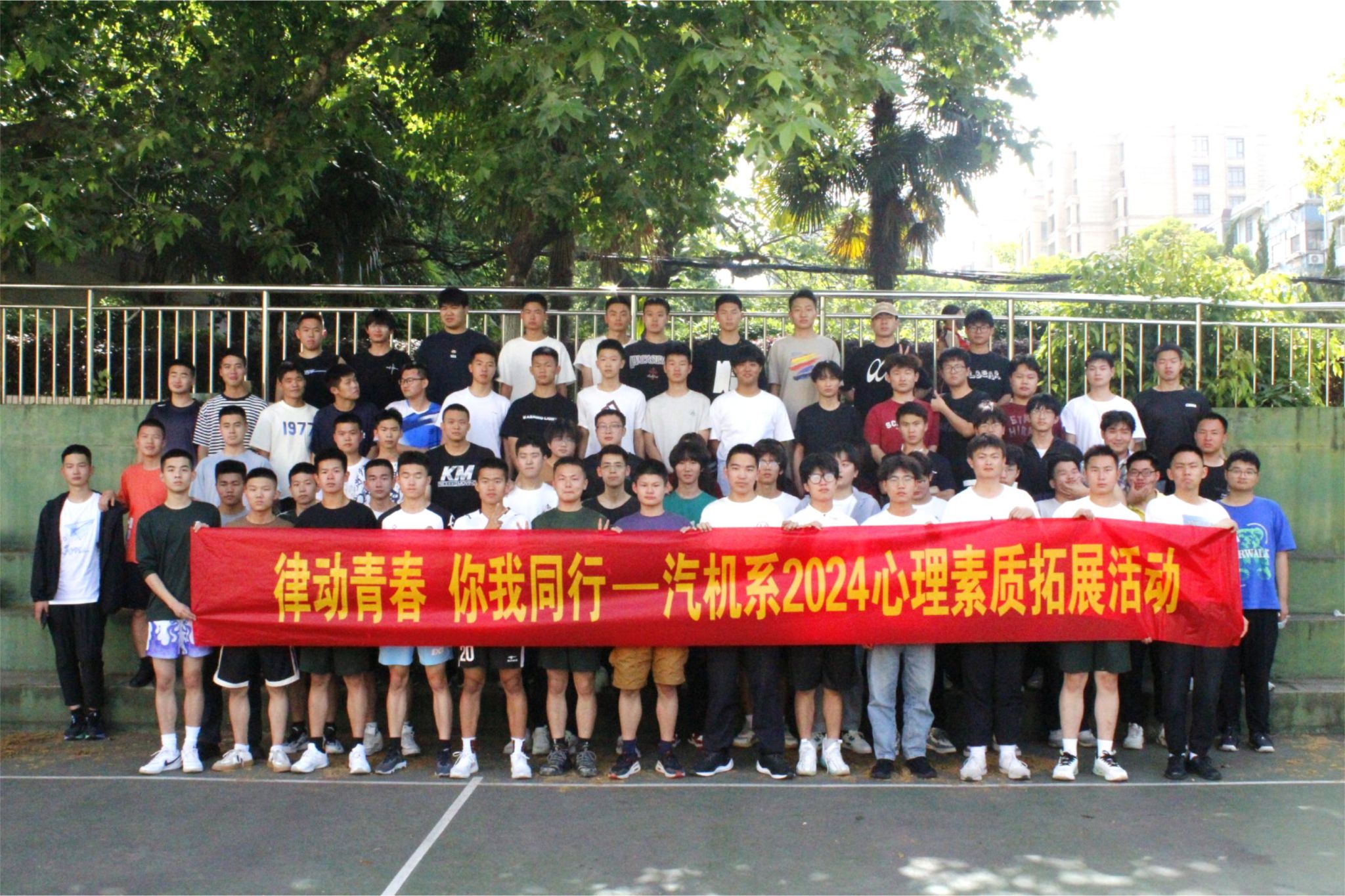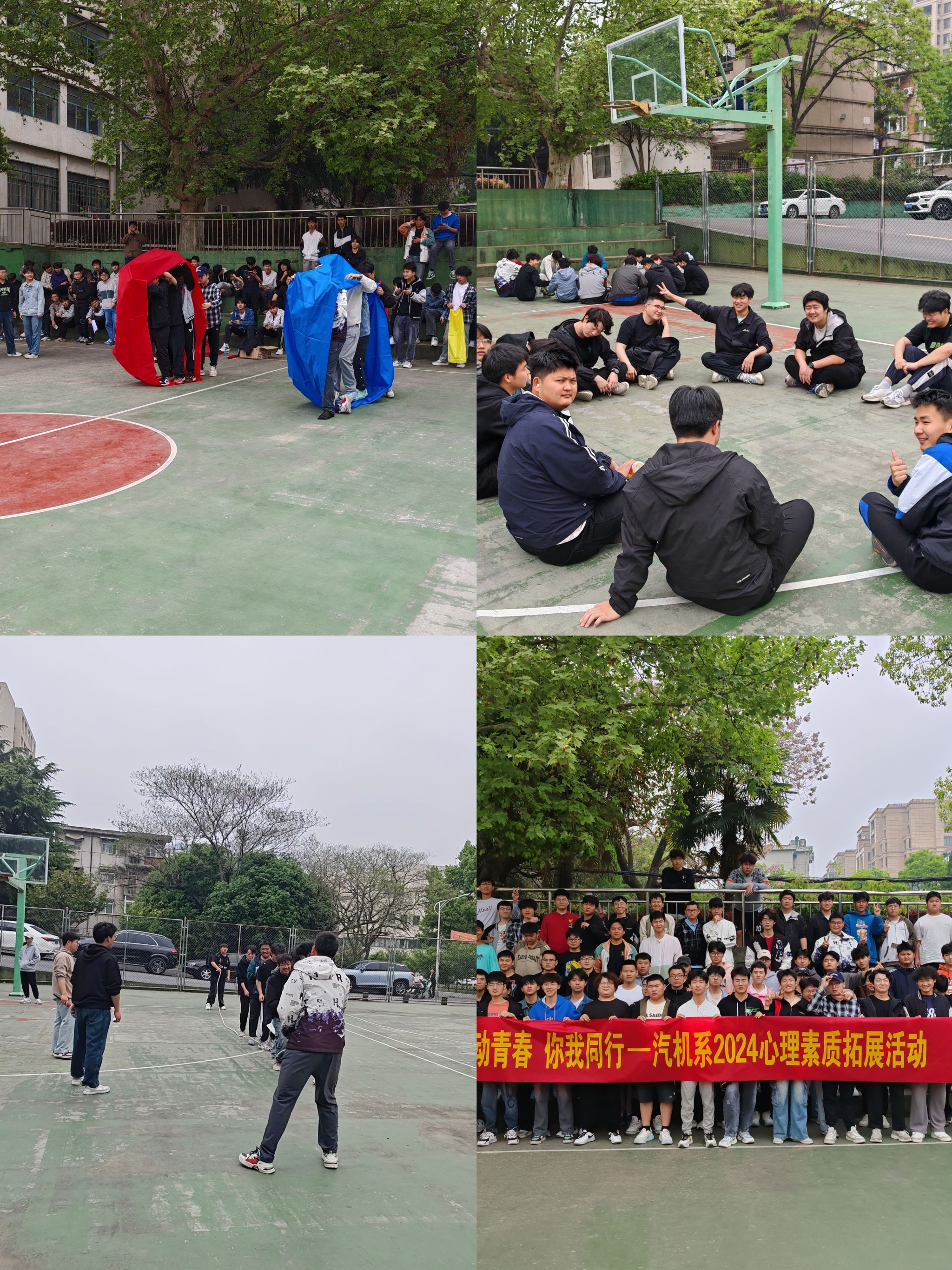 为加强同学们的沟通与交流,缓解在学习生活中的压力,养成健康良好的心态,4-5月,汽车与机械工程系在南区篮球场开展了两期以“律动青春 你我同行”为主题的心理素质拓展活动。
