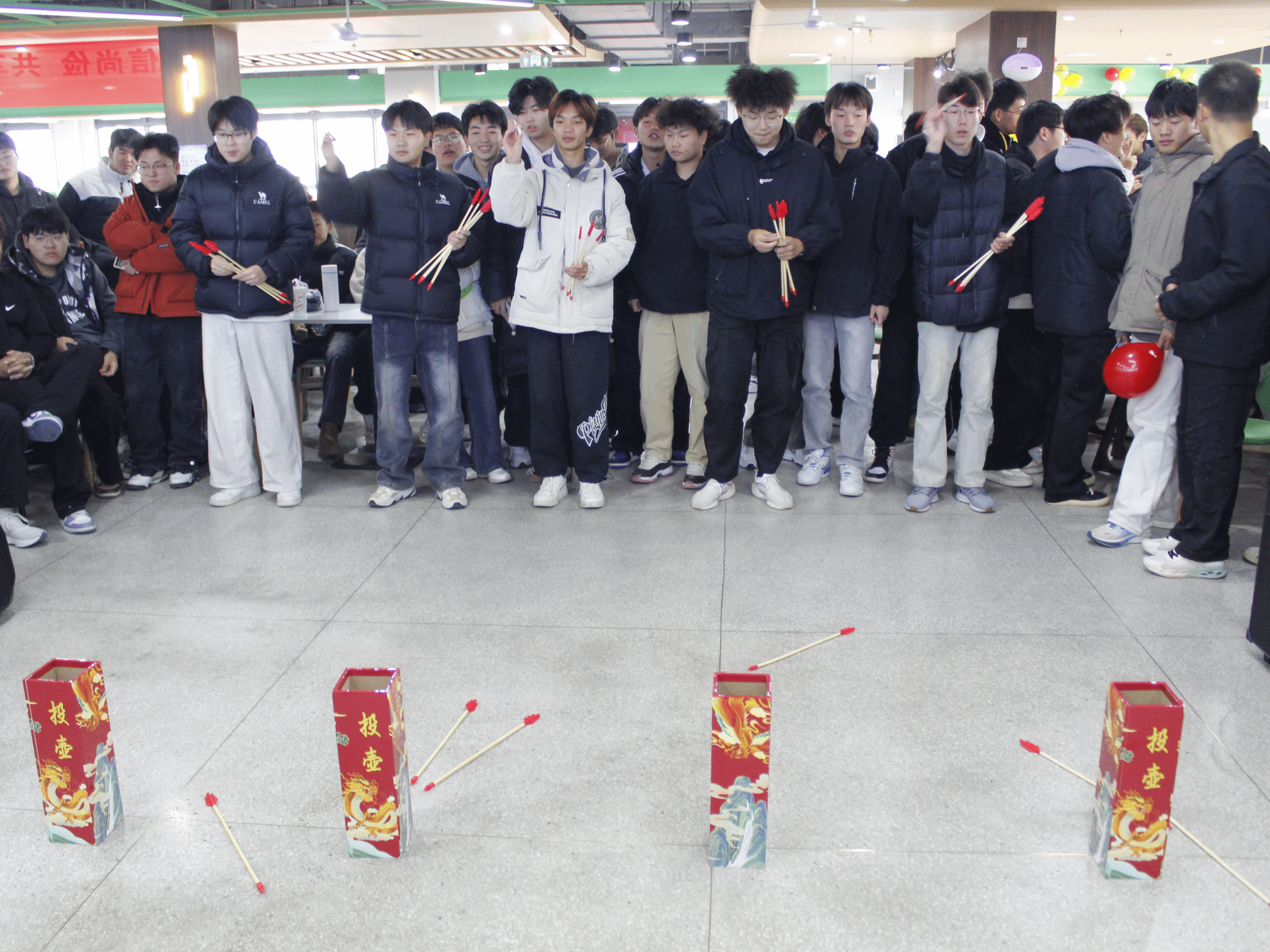 选手们精心制作的饺子下锅后,投壶比赛随即精彩上演。参赛代表们全神贯注,瞄准目标,次次投掷均展现出专注与耐心。这项传统游戏不仅考验选手们的恒心与耐心,更让系部学子从中感受到优秀传统文化的魅力。