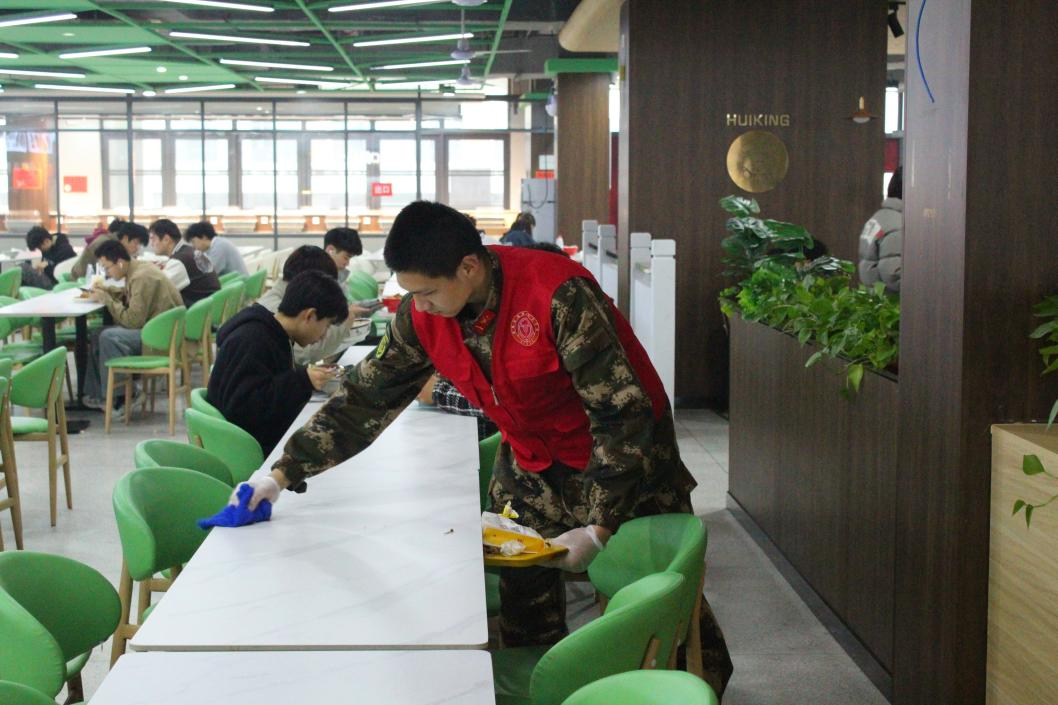 躬身实践,擦亮文明底色。活动期间,志愿者们身着统一服装,分工协作,投身食堂各个服务岗位。食堂就餐区内,志愿者们认真擦拭餐桌、清理食物残渣,并对地面、楼梯扶手等区域进行细致打扫,确保就餐环境干净整洁;在餐盘回收处,志愿者主动引导同学们分类放置餐具,宣传“光盘行动”,减少食物浪费;就餐高峰期,志愿者们协助维持队伍秩序,提升用餐效率;部分参与过专业培训的志愿者走进后厨与窗口,帮助食堂工作人员分装菜品、递送餐盘,用行动传递对劳动者的尊重与关怀。