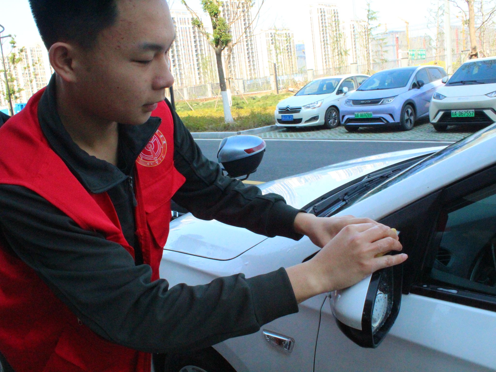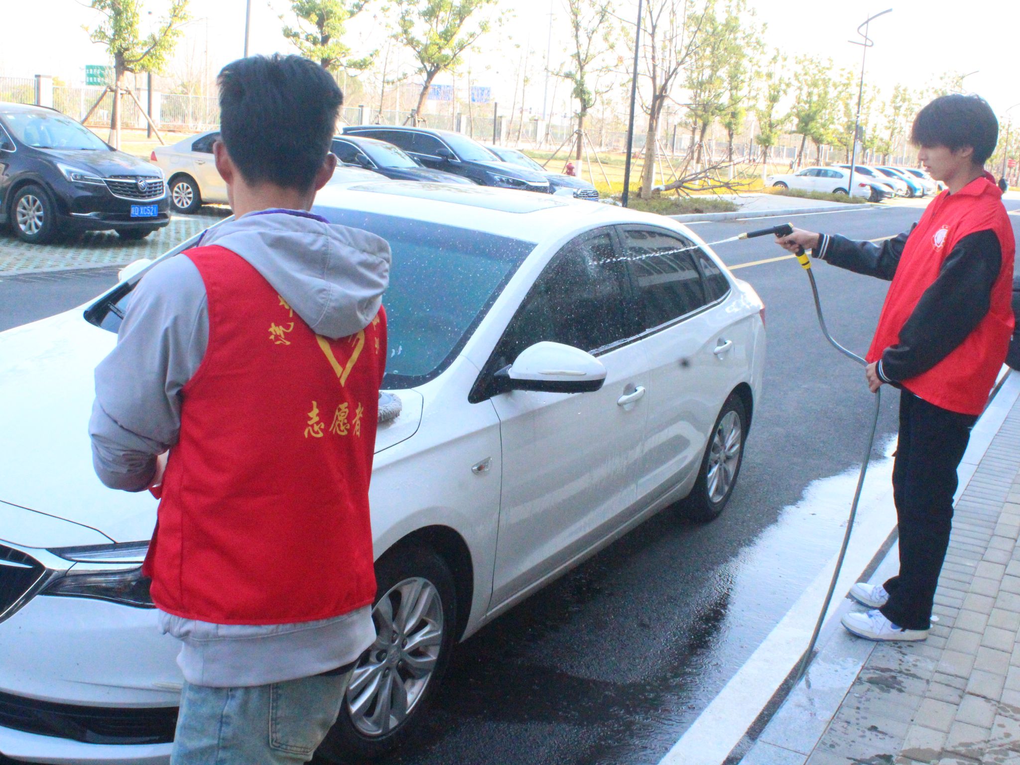 专业技能服务师生,知识转化实践能力。汽检专业学生志愿者身着统一工装,携带专业工具,在致远楼B区搭建起临时“车辆养护服务站”。志愿者们分组协作,为教师的各类车辆提供车身清洗、玻璃水添加、内饰除尘等基础养护服务。操作过程中,志愿者们严格遵循标准化流程,从预检车辆外观,到水流冲洗、使用无痕毛巾分区擦拭、调配专用清洁剂去除顽固污渍,均展现出扎实的专业功底。
