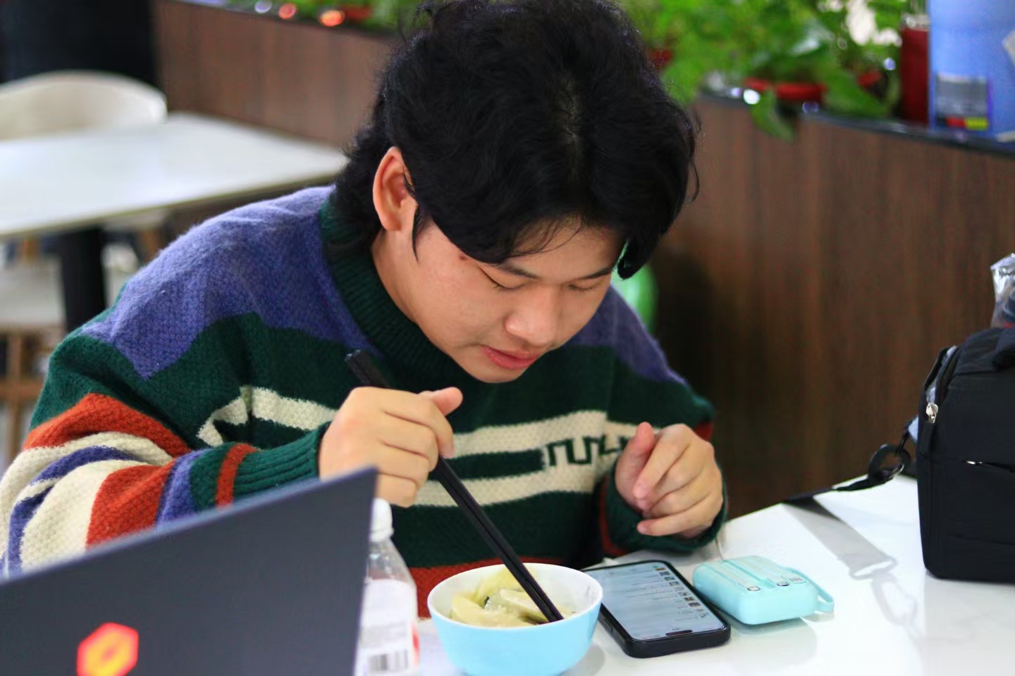 活动现场暖意融融,处处洋溢着热闹祥和的氛围。作为活动核心环节的包饺子比赛率先拉开序幕,同学们迅速组队、分工协作,揉面、擀皮、包馅、捏褶一气呵成。擀皮时的默契配合、捏褶时的细心专注、创意造型时的欢声笑语,不仅让同学们快速掌握了包饺子的实用技能,更深刻体会到“众人拾柴火焰高”的团队力量,真切感受到劳动过程中的专注与快乐。