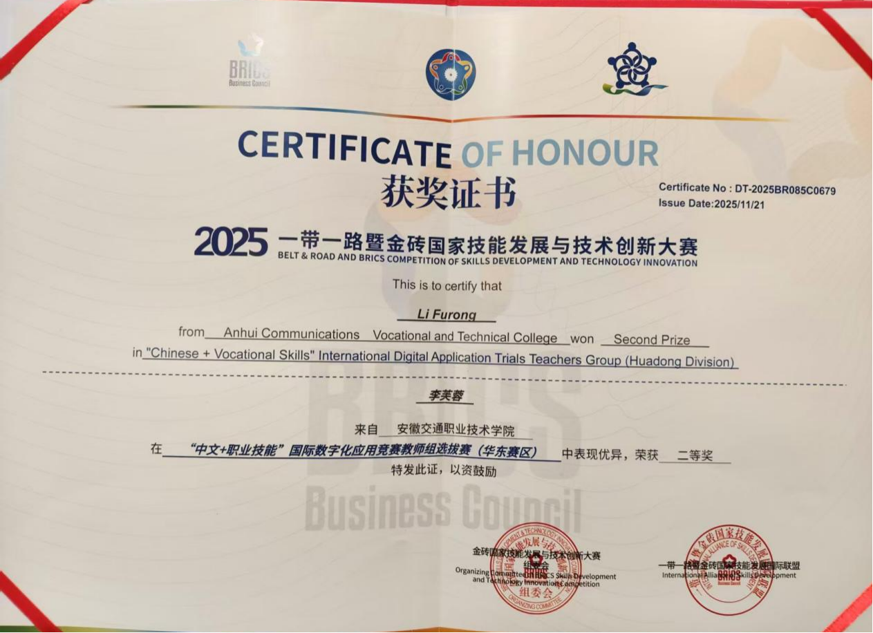 作为一场极具影响力的国际赛事,本届竞赛自2025年4月启动以来,先后在哈尔滨、重庆、南昌等七大赛区开展选拔,共吸引海内外近2000名选手参赛,最终仅500余人晋级博鳌总决赛。华东赛区选拔赛中,李芙蓉便凭借优异表现拿下教师组二等奖,成功锁定总决赛席位;决赛现场,她再将中文教学与真实工作场景深度融合,实现职业技能传授与中华文化传播有机统一,最终再度斩获佳绩。