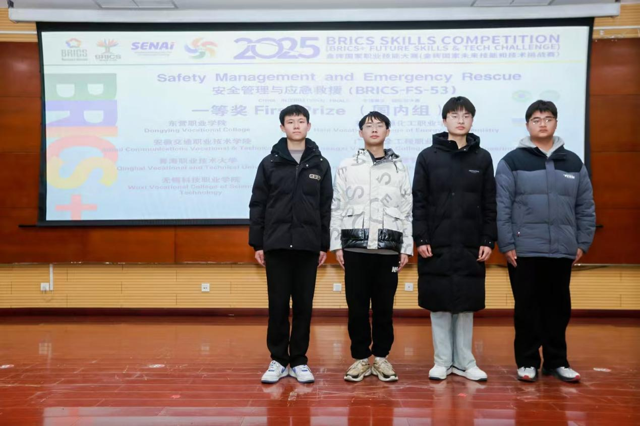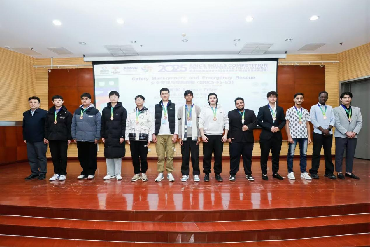 12月22日至25日,2025金砖国家职业技能大赛“安全管理与应急救援”赛项国际总决赛顺利闭幕。由土木建筑学院党总支副书记王佳宾领队,史晴晴、袁和勇两位老师指导,24安全1班刘乐乐、杨子麟、陈志豪、陈礼豪四名同学组成的参赛团队,与来自中国、俄罗斯、印度、巴西、南非及阿富汗、巴基斯坦等十余个国家的78支队伍同台竞技。最终,团队凭借扎实的专业功底和出色的临场发挥,斩获国内组一等奖第三名、国际组一等奖第四名(铜奖)的优异成绩。
