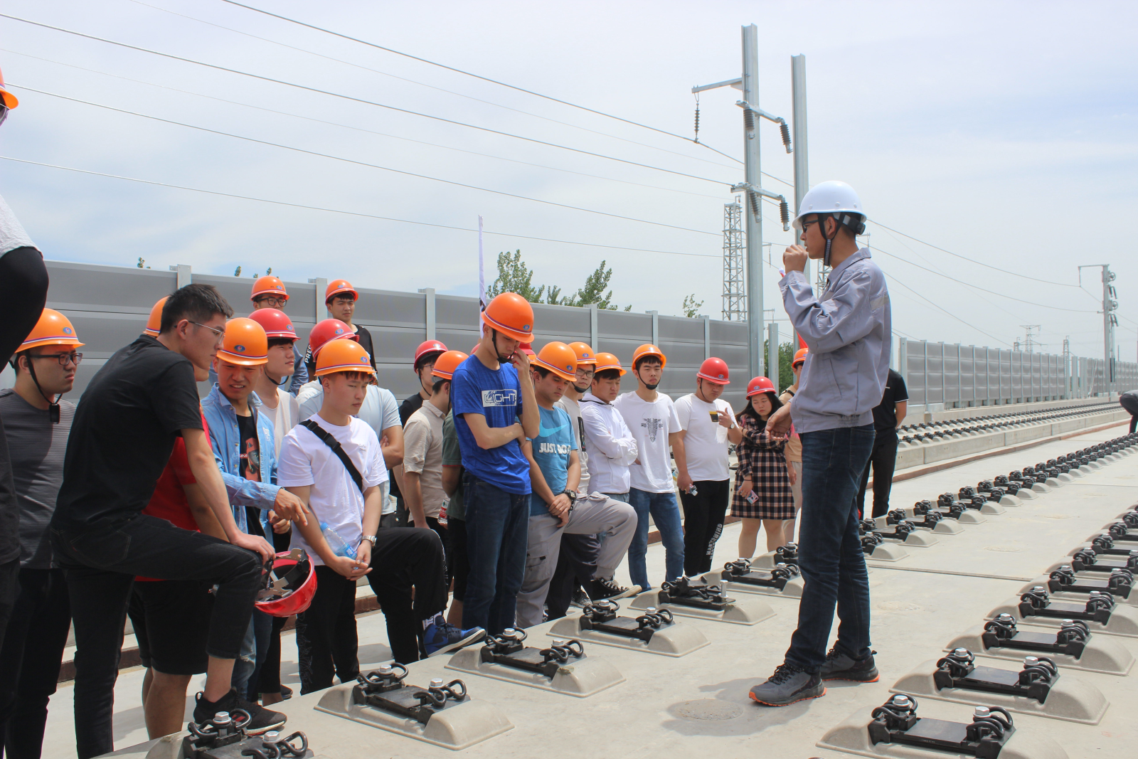 项目总工在现场为同学们讲解目前国内技术最先进无砟轨道三型板的施工工艺、施工流程及施工控制,对同学提出的问题及时地进行解答。无砟轨道是当今世界先进的轨道技术,列车时速可以达到400公里以上,同时可以减少后期维护成本、保障高铁运营环境。
