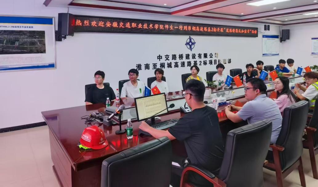 随后,同学们又奔赴新建的淮铜高速淮南段2标段施工现场。在这里,中交路桥建设有限公司项目总工李高平亲临现场,为学生们详细介绍庄墓河特大桥项目情况,涵盖主桥施工流程、引桥梁板预制施工工序以及桩板式路桥施工工艺等关键环节。通过项目虚拟动画和实景航拍视频,李总工生动地展示了项目建设全过程,并耐心解答了同学们的提问,让同学们对路桥建设有了更直观、更深入的认识。