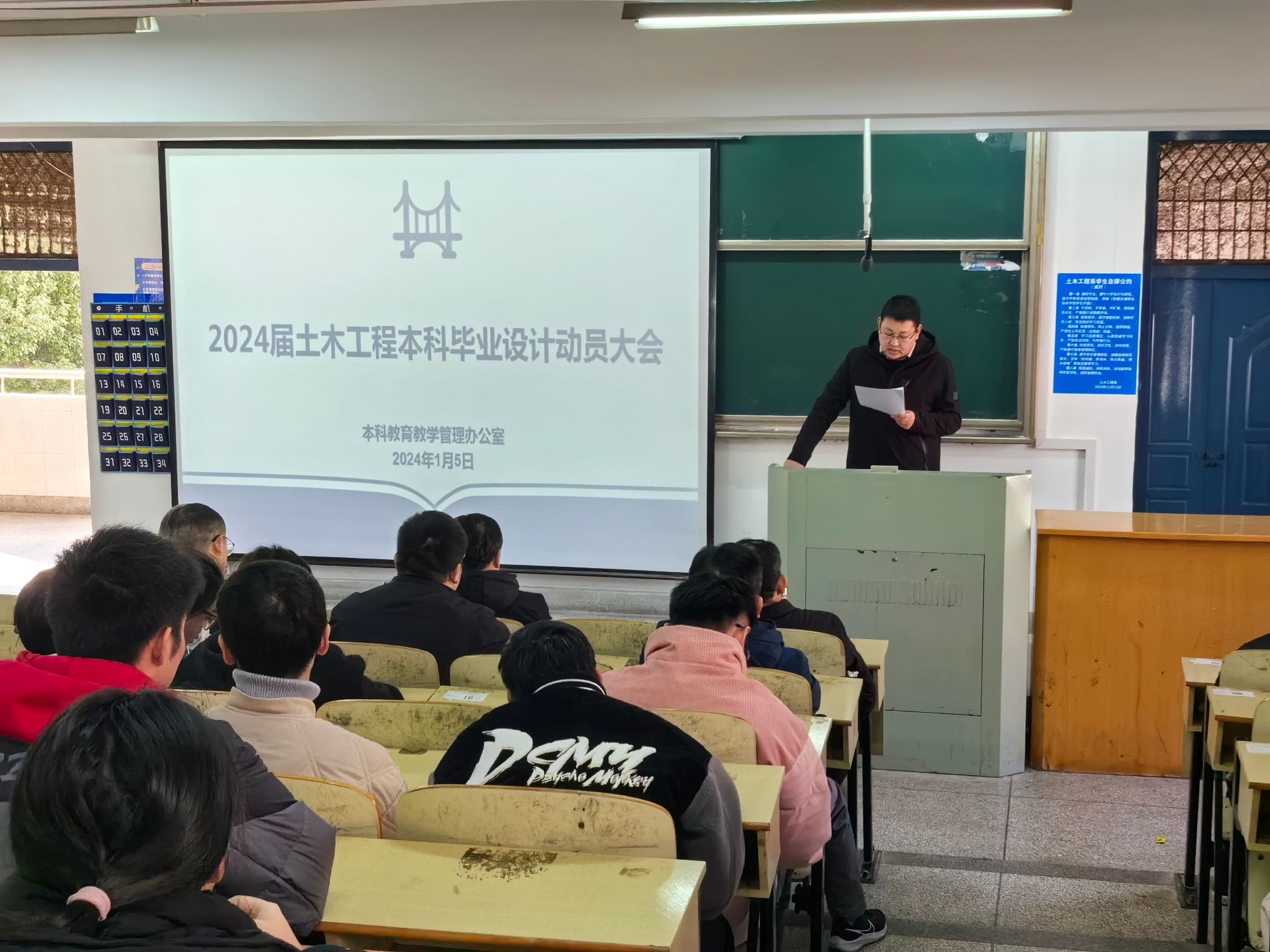 为确保2024届土木工程专升本学生毕业设计的顺利进行,提高毕业设计成果水平,2024年1月5日下午土木工程系召开本科班毕业设计动员大会,系主任王东,副主任肖玉德、王守胜,本科教育教学管理办公室主任孙鹏轩,全体指导教师及2024届毕业生参会。
