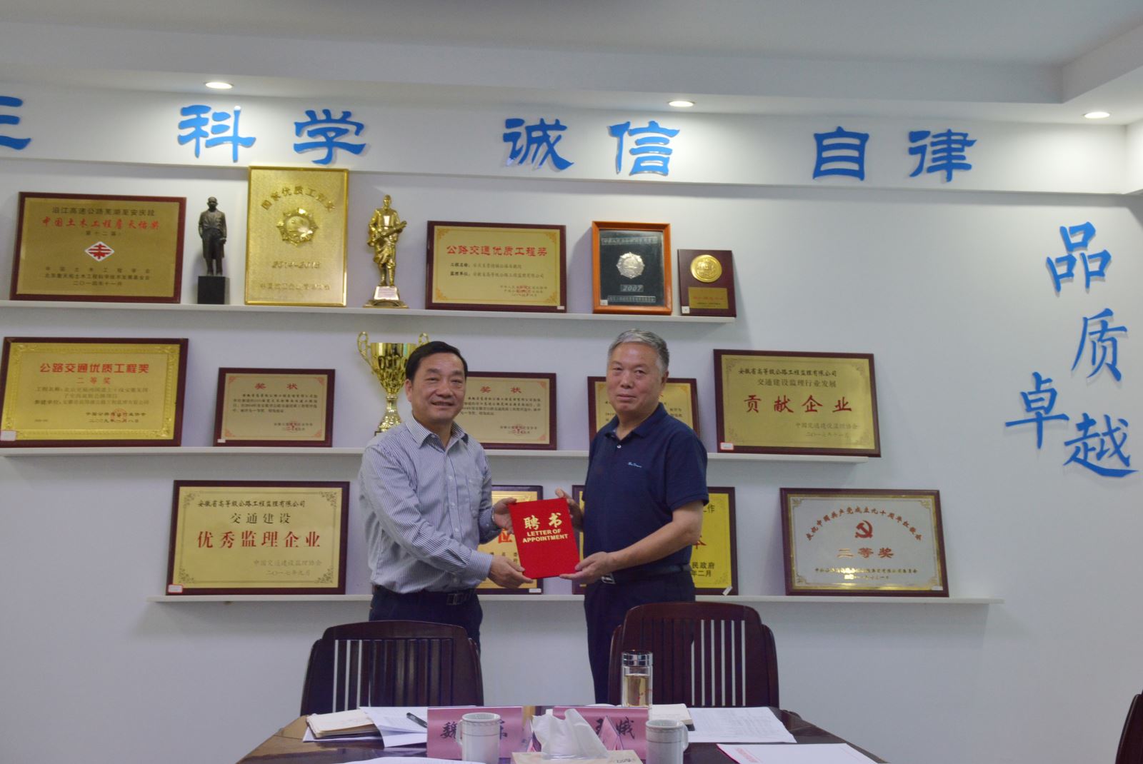 张国栋院长为安徽省高等级公路工程监理有限责任公司杨东林书记和陈传明总经理颁发了客座教授证书。