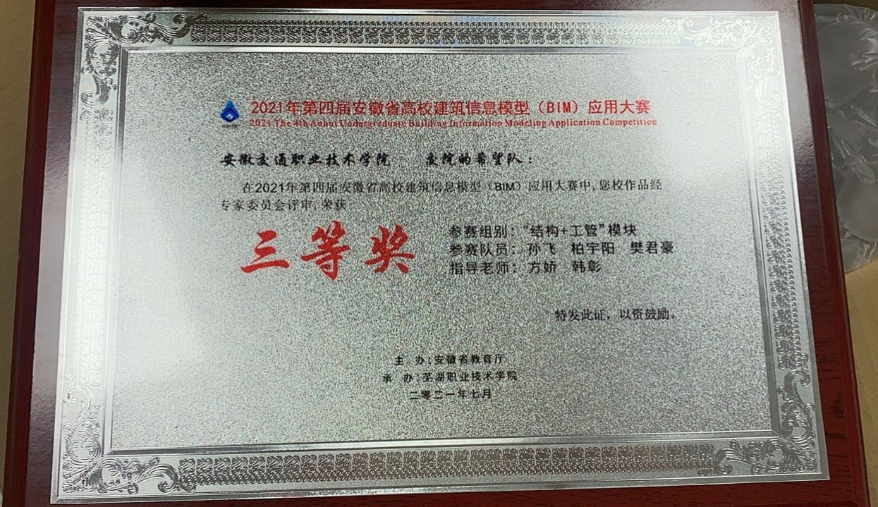2021年6月17日至6月19日,由 安徽省教育厅主办,芜湖职业技术学院和合肥工业大学承办的第四届安徽省高校建筑信息模型(BIM)应用大赛在安徽芜湖举行。