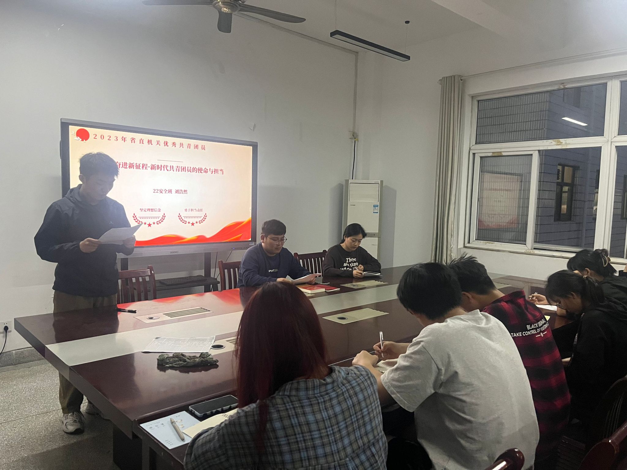 本次活动特地邀请了获得“2023年度省直机关优秀共青团员”称号的我系22安全班刘浩然同学进行报告分享。刘浩然同学连续4年获得团员优秀评议等级,曾获县级优秀团员,代表学院参赛获得消防安全类国赛二等奖,多次参加志愿服务,品学兼优。