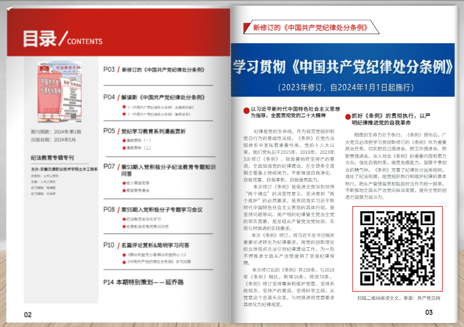 为积极响应党中央部署安排,深入开展党纪学习教育,贯彻落实省交通运输厅全面动员部署党纪学习教育精神、学院党委关于开展党纪学习教育的实施方案,土木工程系以学习贯彻新修订的纪律处分条例为契机加强纪律教育,编发完成了2024年首期《纪法教育专刊》。