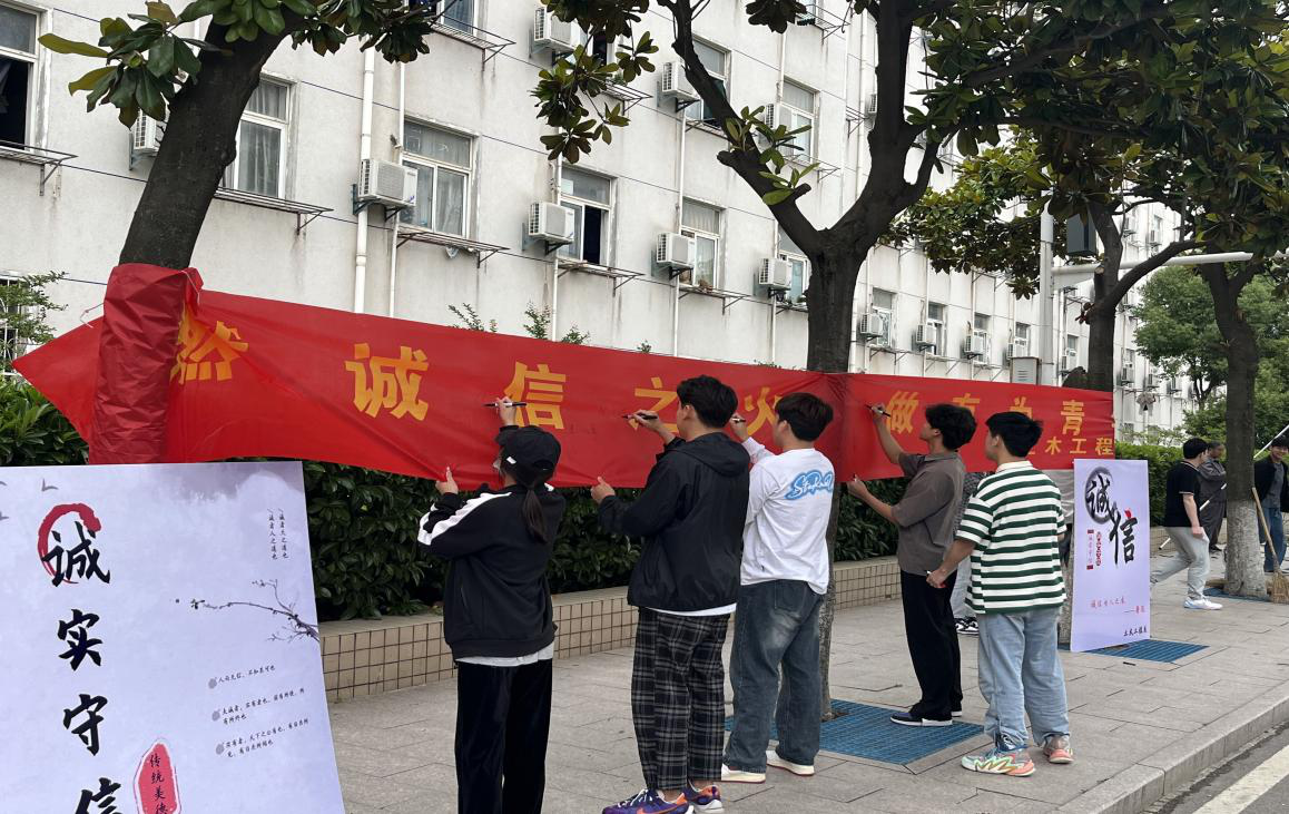 为弘扬交院“诚信为本,一诺千金”的校园精神,土木工程系团总支在米兰学生宿舍楼下开展了“诚信签名”的主题活动,通过活动加强米兰学生诚信为本的理念。本次签名活动交院学子积极参与,横幅上的签名正是学生们对诚信理念的肯定,活动气氛热烈,在学生会的宣传下,同学们进一步加深了诚信意识,充分认识到诚实守信,理性消费的必要性和重要性。