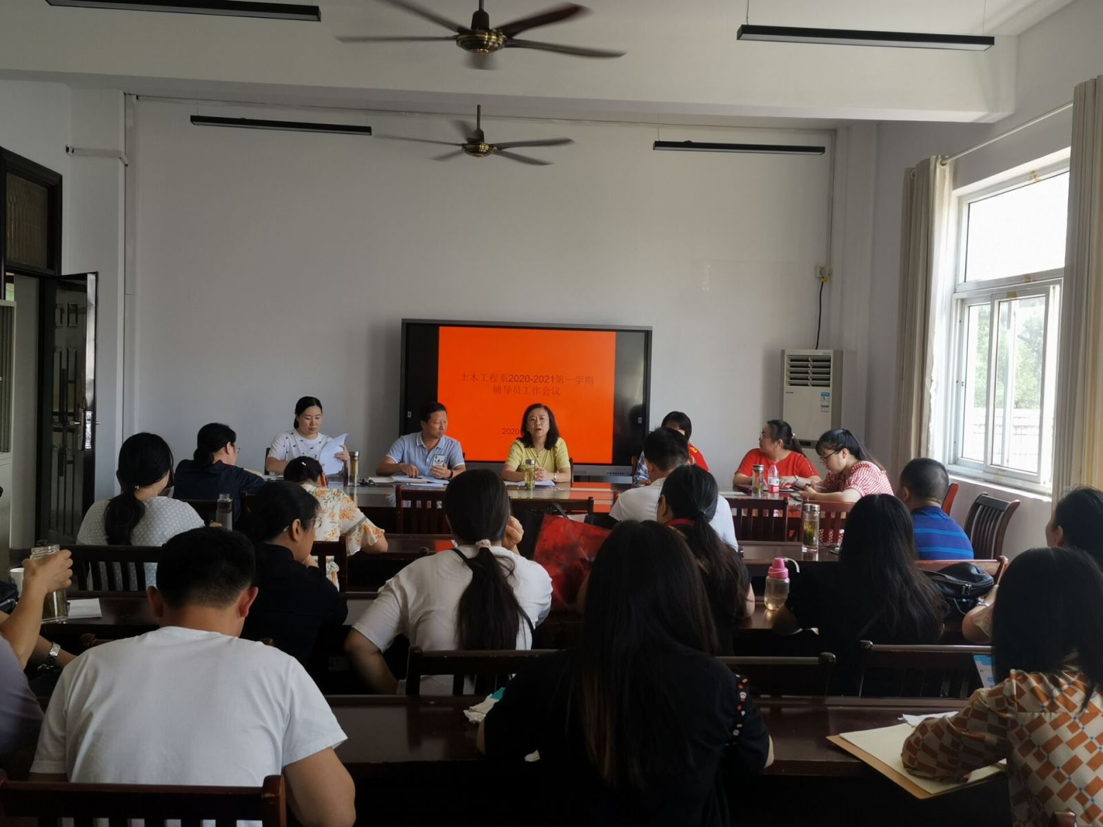 2020年9月4日上午9点30分,土木工程系在系会议室召开新学期全体辅导员会议,由系主任辅导员赵婧主持,系党总支书记邹建华、副书记朱蓉、系副主任王守胜以及全体辅导员参加会议。