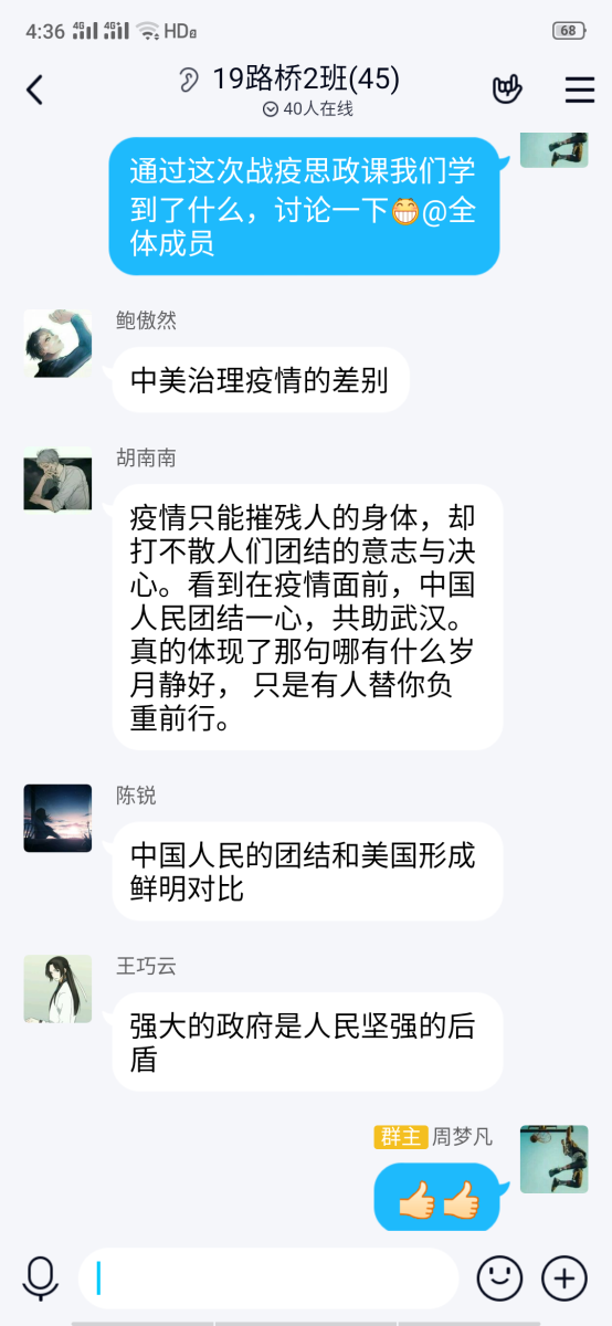 观看完视频后,各班级学生也通过班级群、文档等方式表达了自己的感想。19市政班大部分学生用文字记录了观后感,19路桥6班学生们把观看照片发到了班级群里,18检测1班则在班级群里展开了热烈的讨论,学生们纷纷表示上了这堂课后感触非常深刻。有的学生说,看过视频,感觉自己现在面临的困难都不算困难了;有的学生说,同样都是年轻人,护士和快递小哥比自己勇敢;有的学生说,天天在家里呆着还嫌无聊,现在再也不敢了,所有的岁月静好都是因为有人在替我们负重前行;有的学生说,我们在家认真上网课,提高自己管理自己的能力,就是在为防疫做了自己力所能及的事情;在九华山风景区做防疫志愿者的16路桥3班胡健伟同学说,生命中有这样一段做志愿者的经历,非常光荣和骄傲,自己在用实际行动参与了抗击疫情,虽然口罩很闷,手套很紧,防护服很厚重,但自己的心里是欣慰的,是激动的。