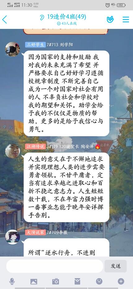 由系里制定出班会的策划案,各位班长负责实施,在会上通过观看资助政策、感恩励志短视频及文章,让疫情在家已久的同学们感受到了学校集体的存在感、激发了同学们拼搏进取的动力,同学们纷纷在班级群里发表自己的感言,也表明了自己要努力向上,积极回馈社会的决心。
