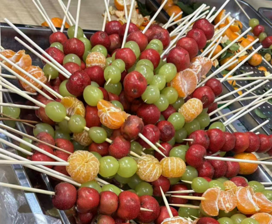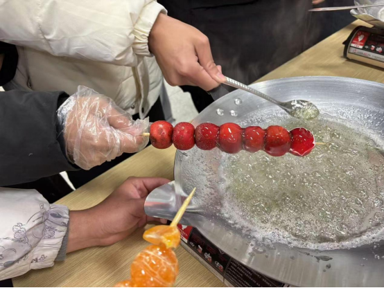 活动现场被分为两个区域:冰糖葫芦制作区和桌游区。糖葫芦区宛如一个甜蜜的小天地。新鲜饱满的山楂,晶莹剔透的葡萄,色泽鲜艳的橘子被整齐的串好摆放。旁边的烤炉上,糖浆正在锅里缓缓熬制,散发出甜丝丝的气息。学生会志愿者为同学们详细讲解了糖葫芦的悠久历史和传统制作工艺,展示了制作糖葫芦的过程。随后引导同学们将串好水果的竹签放入熬制好的糖浆中轻轻转动,不一会儿,一串串色泽诱人,裹着晶莹糖浆的冰糖葫芦就制作完成了。