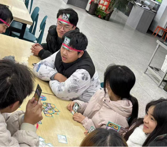 桌游区同样热闹非凡,大家围坐在桌旁,沉浸在益智游戏的世界里。同学们需要诱导对方做出他们头顶上写的动作,选手们或眉头紧锁,或气定神闲,演技和套路齐飞,战略和智慧在博弈中展现的淋漓尽致。这种集推测和提问于一体的游戏,让每一局都充满了变数和惊喜。