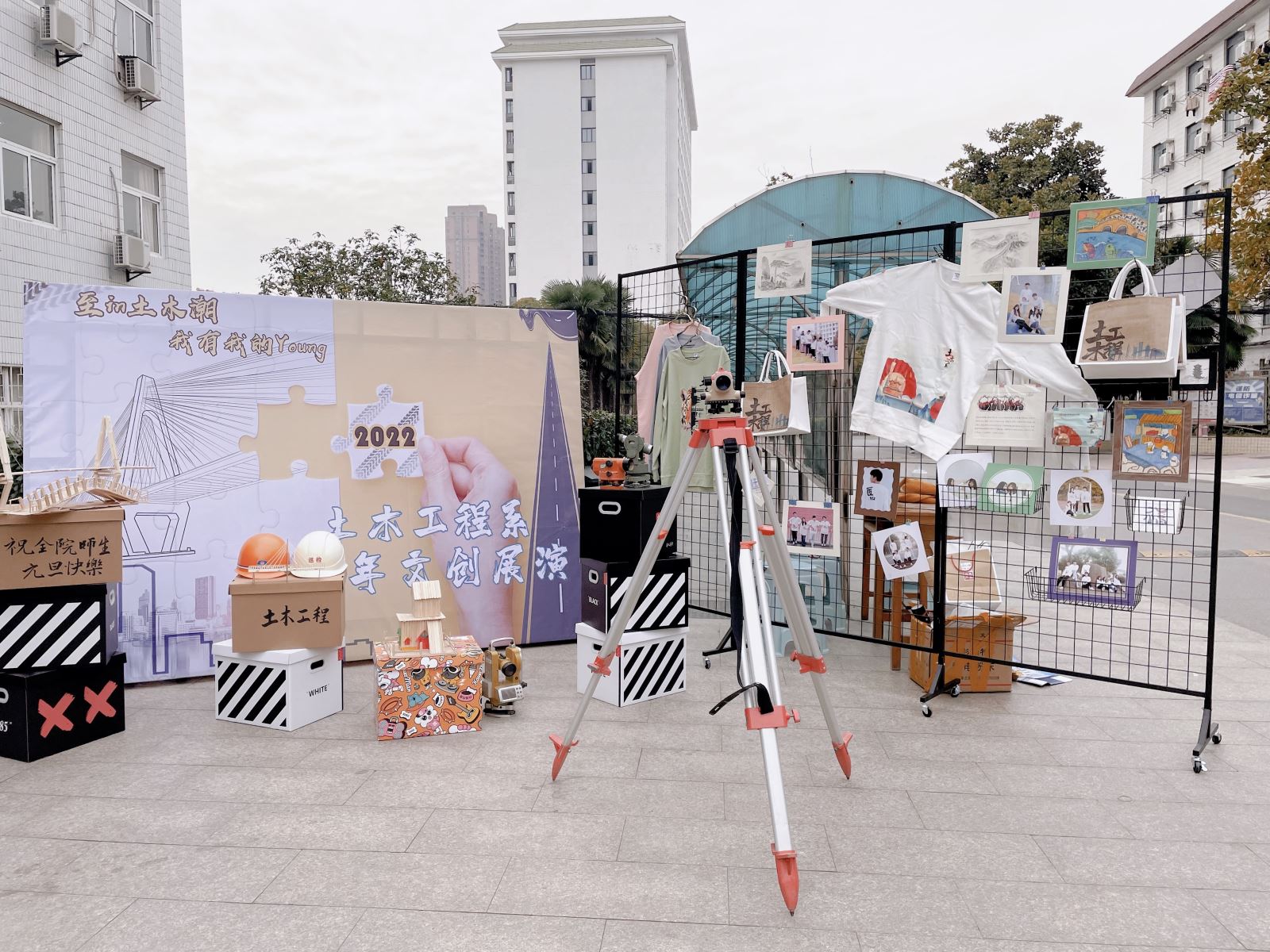 2021年12月31日,土木工程系在团总支学生会的策划下,在教学楼下开展了“至in土木潮 我有我的Young”跨年文创展演活动。土木工程系学生党支部也参加了此次活动,系部老师和学生一起动手,共同完成了此次展演的布置。
