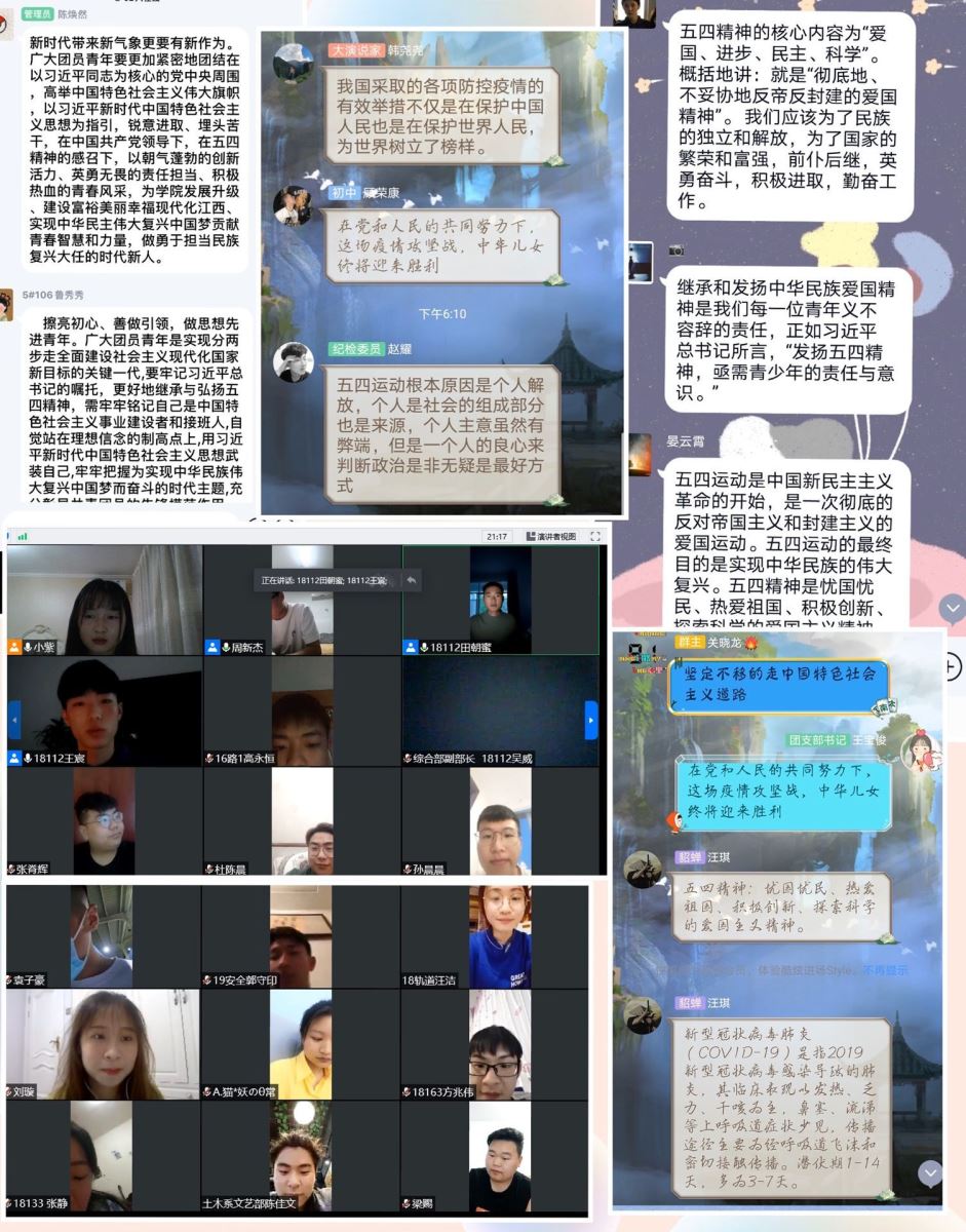结合疫情防控实际,本次活动以线上为主,引导学生深刻理解“五四”精神内涵,传承五四精神,牢记党的嘱托和团的宗旨,继承团的光荣传统,不断增强政治意识、组织意识、模范意识。各团支部开展了学习与讨论,帮助同学了解五四运动的历史意义与时代价值,解读疫情期间新时代青年的使命与担当。