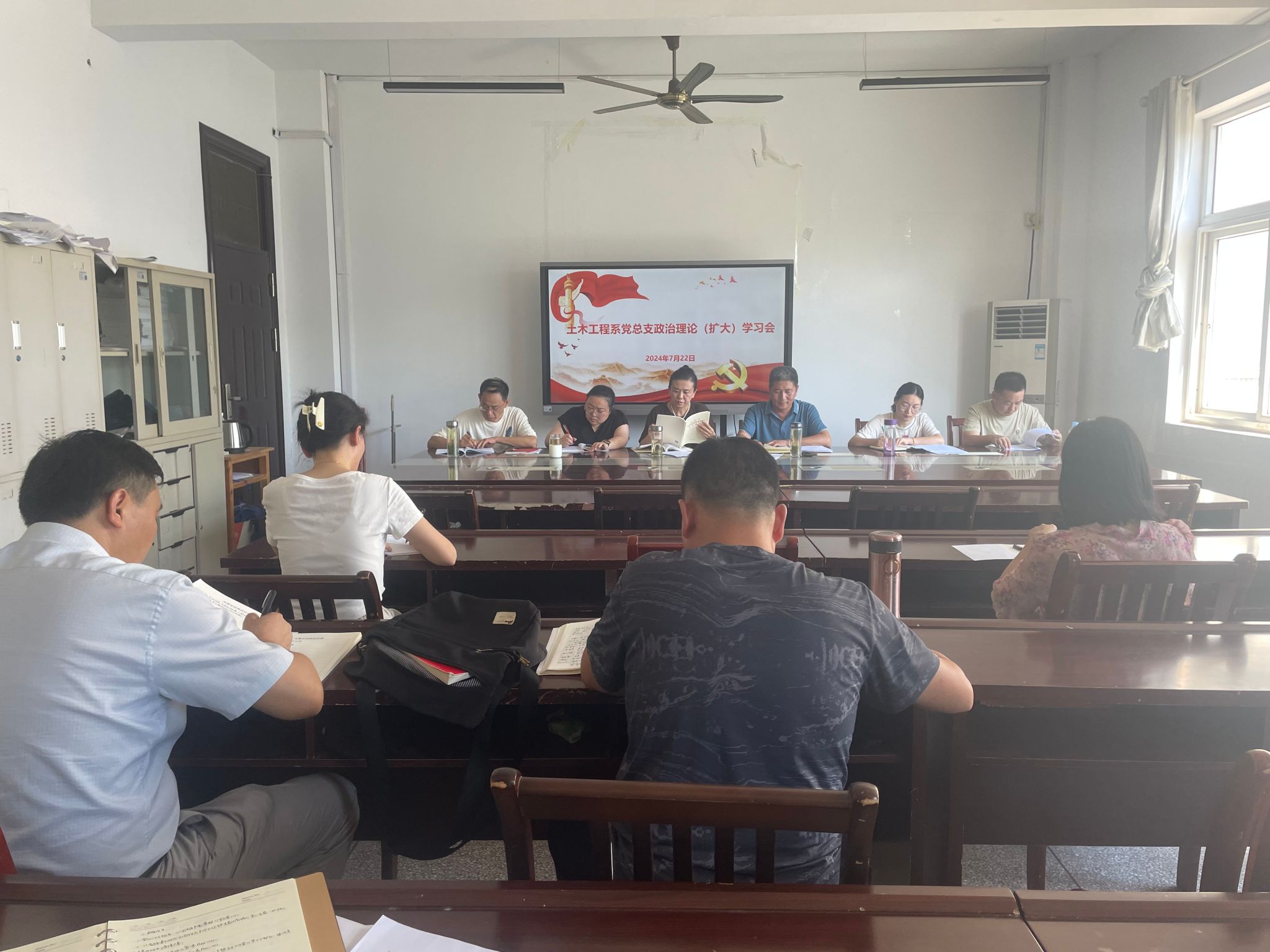 7月22日下午,土木工程系党总支召开政治理论(扩大)学习会,系领导班子、副科级以上干部、支部书记参加学习。系党总支副书记、主任王东主持会议。
