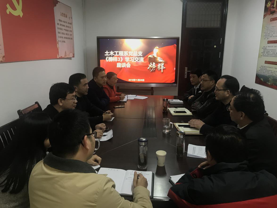 11月28日下午,土木工程系党总支组织党员同志观看了电视专题片《榜样3》并进行座谈交流。会议由系党总支书记邹建华主持会议主持,土木工程系中心组学习成员、副科级以上干部、支部书记参加会议。