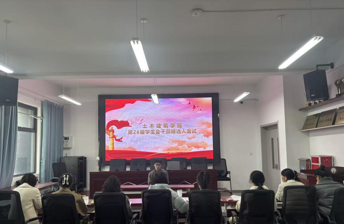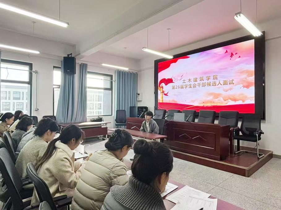 11月26日下午,土木建筑学院2025年学生会干部候选人面试顺利举行。本次面试旨在选拔新一批有能力、有担当的学生会骨干,近30名优秀同学参与角逐,评审团由学院团委老师及学管老师共同组成。