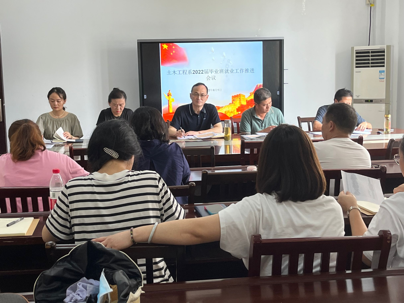 8月1日下午2点30分,土木工程系在系会议室召开2022届毕业生就业工作推进会议,系党总支书记邹建华,系主任王东,副书记朱蓉,副主任王守胜以及2022届辅导员参加。