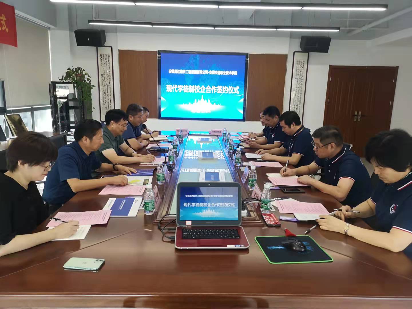 9月28日下午,学院与安徽昌达路桥工程集团有限公司签署校企合作协议。公司董事长、总经理笪建伟,副总经理朱大金、潘美洲、程皋、吴泽敏及公司所属相关部门负责人等参加会议。副院长王丰胜、土木系副主任王东(主持行政工作)、副主任王守胜、办公室主任汪伟伟及教务处倪文蕾老师出席会议。